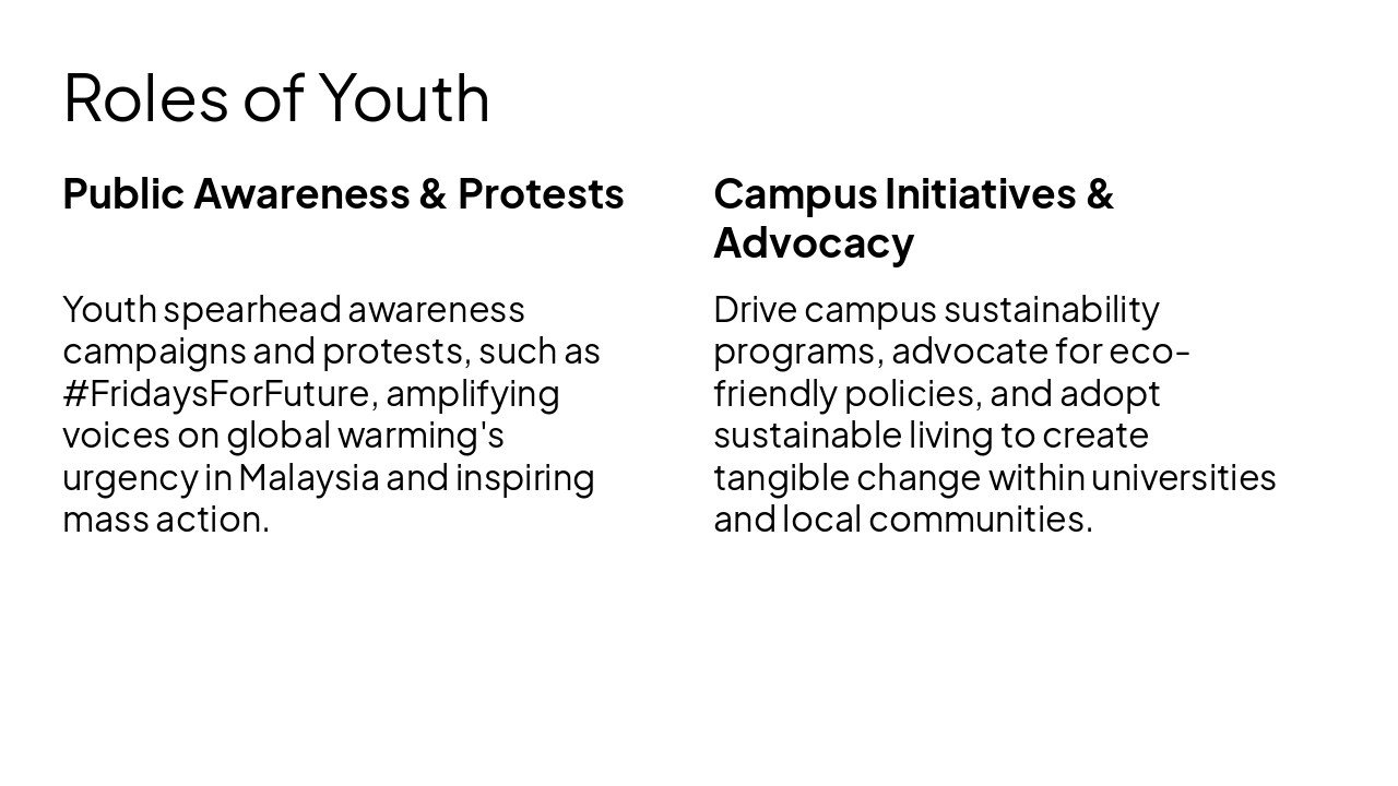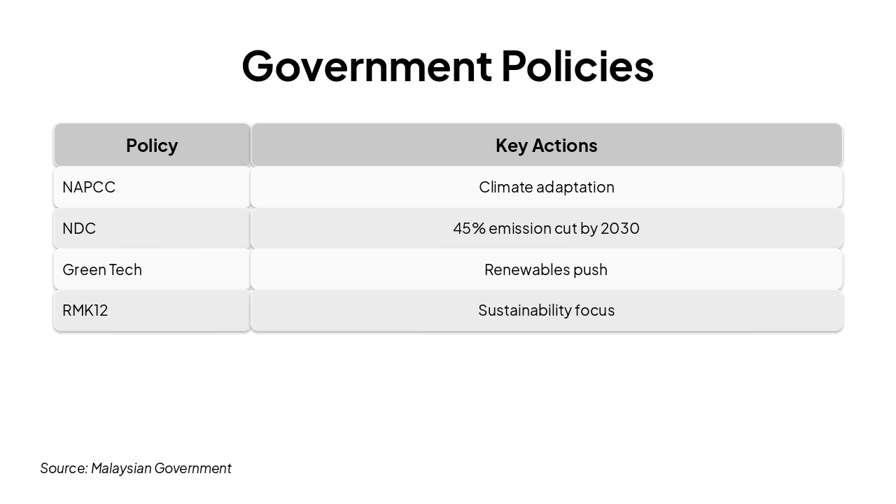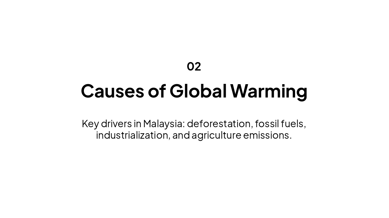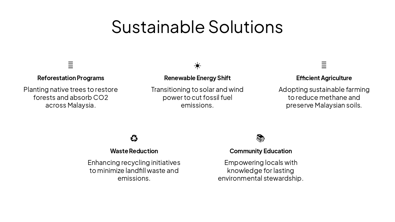 { "features": [ { "icon": "🌳", "heading": "Reforestation Programs", "description": "Planting native trees to restore forests and absorb CO2 across Malaysia." }, { "icon": "☀️", "heading": "Renewable Energy Shift", "description": "Transitioning to solar and wind power to cut fossil fuel emissions." }, { "icon": "🌾", "heading": "Efficient Agriculture", "description": "Adopting sustainable farming to reduce methane and preserve Malaysian soils." }, { "icon": "♻️", "heading": "Waste Reduction", "description": "Enhancing recycling initiatives to minimize landfill waste and emissions." }, { "icon": "📚", "heading": "Community Education", "description": "Empowering locals with knowledge for lasting environmental stewardship." } ] }