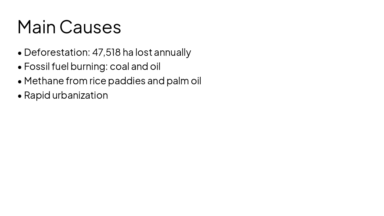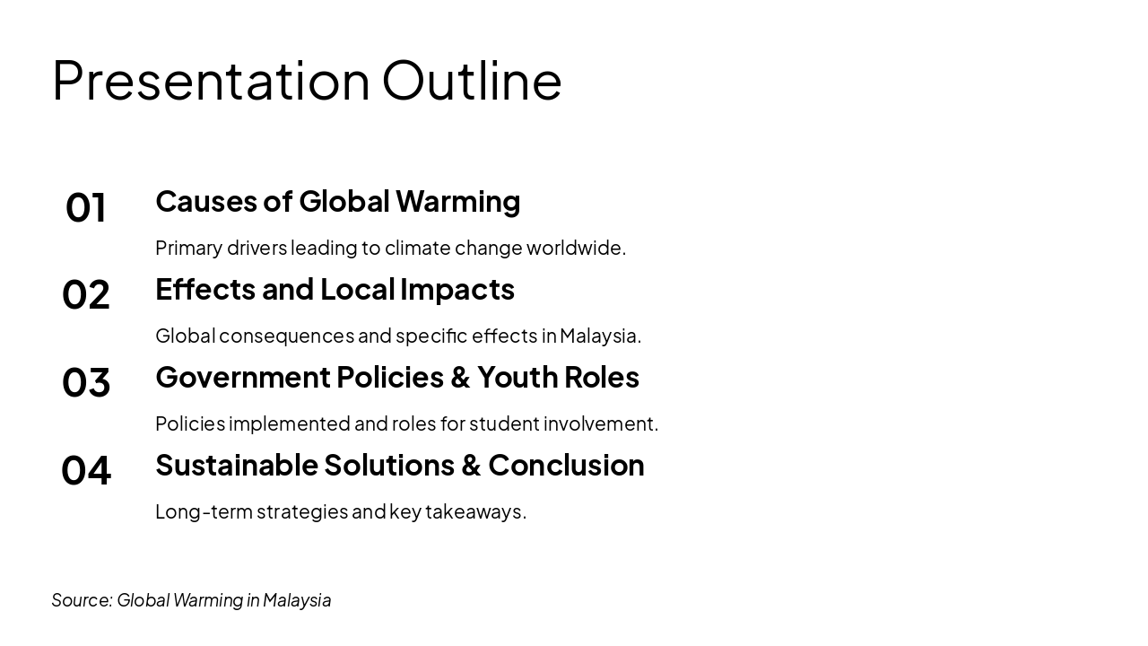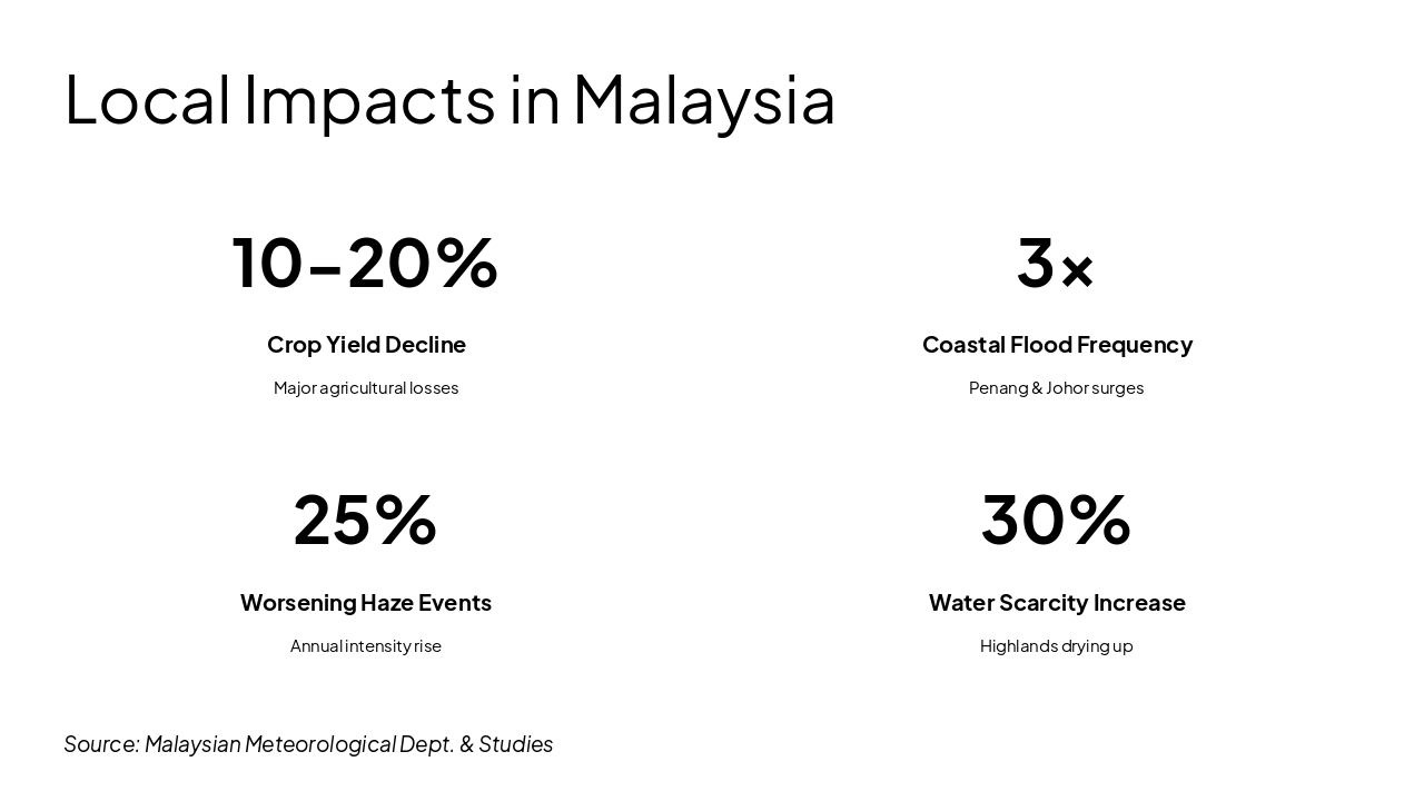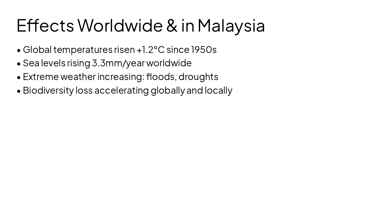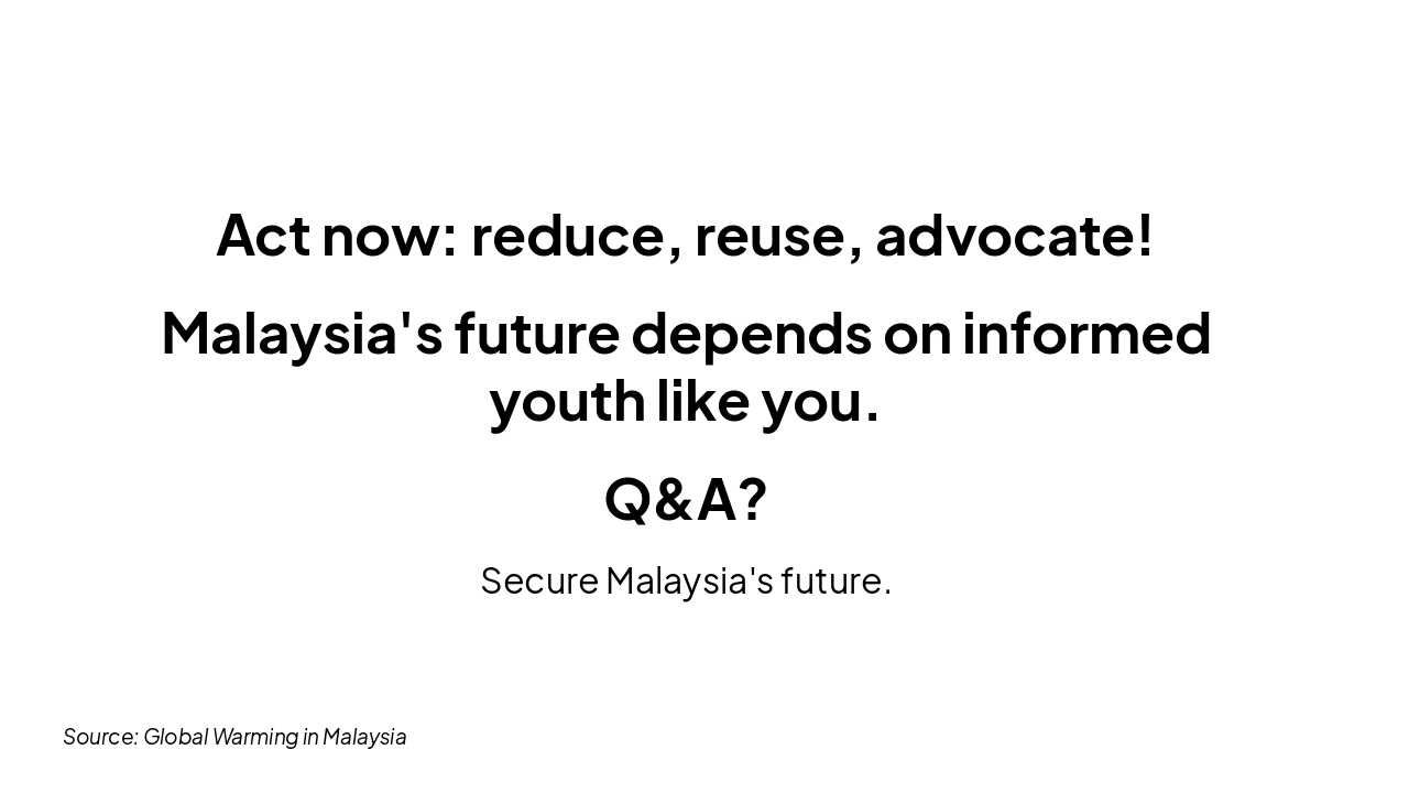The "Sustainable Solutions" slide features a grid of five eco-friendly initiatives in Malaysia, including reforestation to absorb CO2, renewable energy shifts to cut fossil fuels, efficient agriculture to reduce methane, waste reduction via recycling, and community education for stewardship. Each highlights targeted actions with icons to promote environmental restoration and emission reductions.
