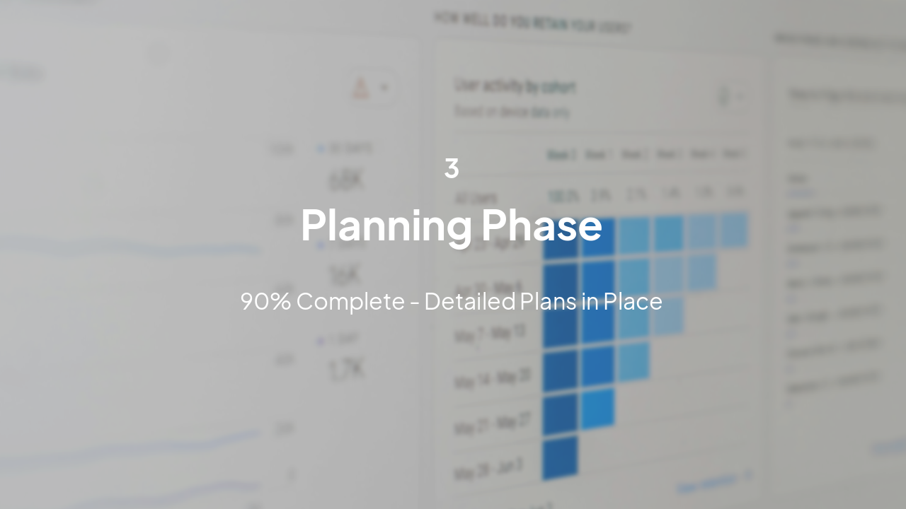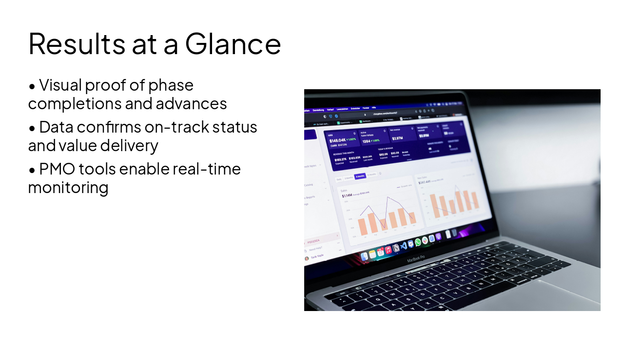 Strong progress across phases: Initiation: 100% Planning: 90% Execution: 60% Proven results via metrics and visuals