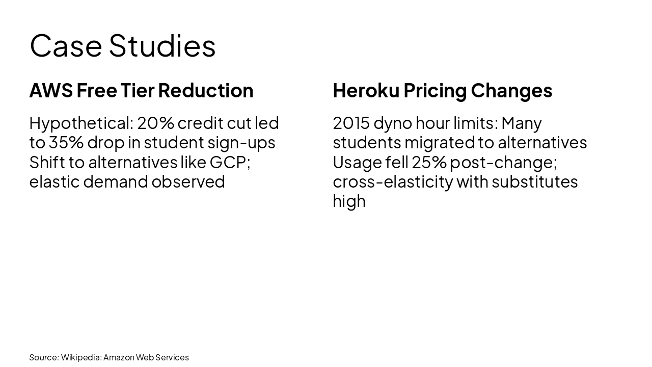 AWS Free Tier Reduction Hypothetical: 20% credit cut led to 35% drop in student sign-ups Shift to alternatives like GCP; elastic demand observed
