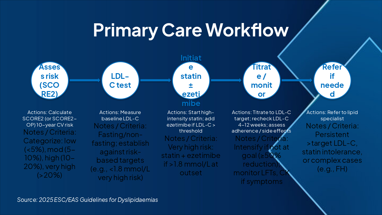 Streamlined primary care workflow for dyslipidaemia management: Assess → Test → Treat → Monitor → Refer as needed. Mirrors ESC flowchart.