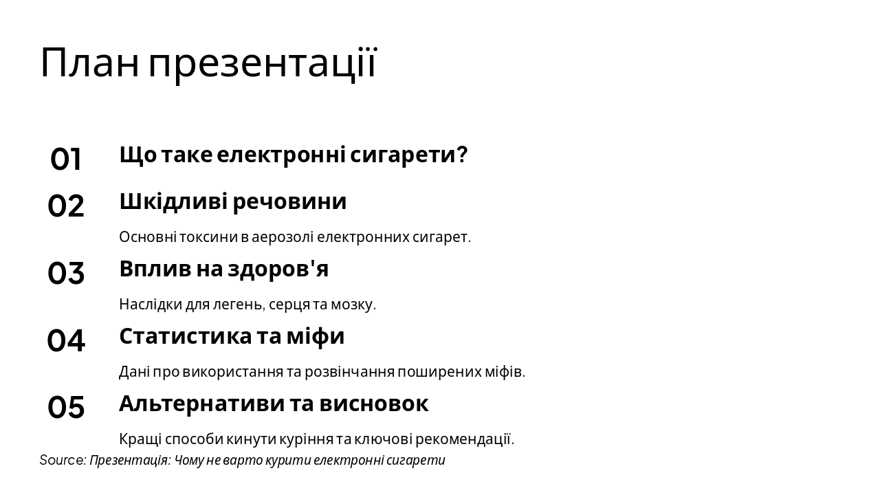 Ця слайд є планом презентації про електронні сигарети. Він охоплює теми: що таке електронні сигарети, шкідливі речовини в аерозолі, вплив на здоров'я (легені, серце, мозок), статистику та міфи, а також альтернативи для кинути куріння з висновками.
