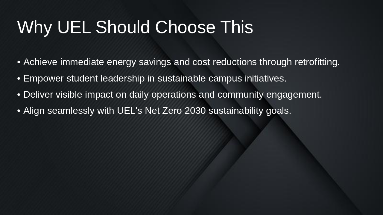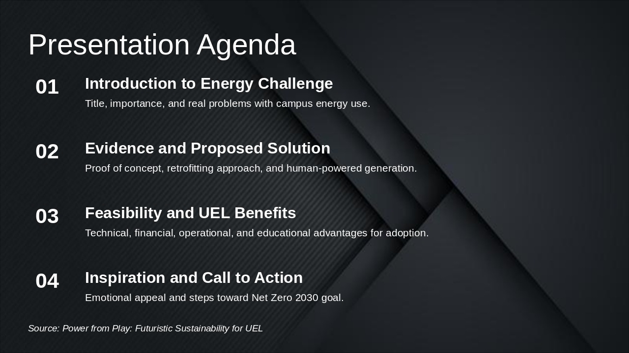 The presentation agenda outlines four key sections: an introduction to the campus energy challenge, highlighting its title, importance, and real problems with energy use. It continues with evidence and a proposed solution involving proof of concept, retrofitting, and human-powered generation; feasibility and benefits for UEL, covering technical, financial, operational, and educational advantages; and concludes with inspiration and a call to action toward the Net Zero 2030 goal.