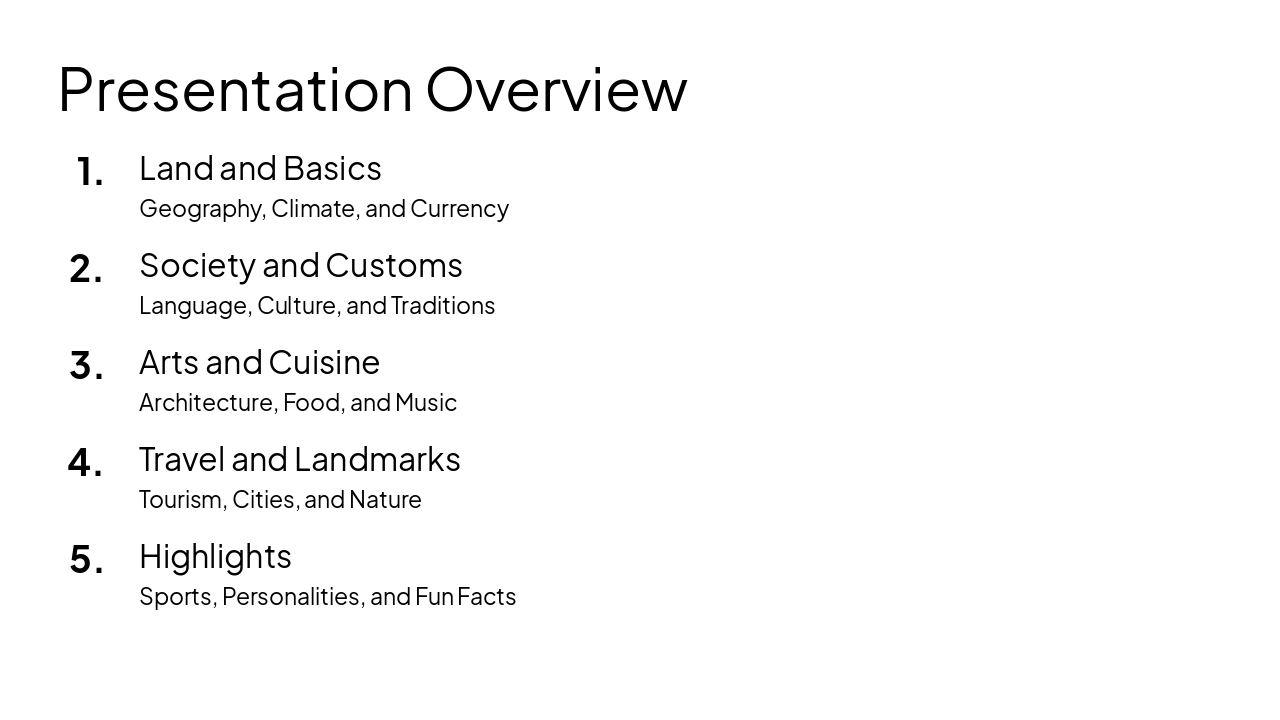 This presentation takes you on a journey through the Kingdom of Morocco, exploring its geography, climate, society, customs, arts, cuisine, top travel destinations, landmarks, sports, notable personalities, and fun facts.