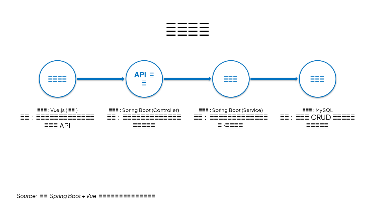 The slide depicts a system architecture workflow from user requests via Vue.js frontend, through Spring Boot API controllers and services for routing, validation, and business logic, to MySQL for data persistence. Each step includes the process, technology stack, and description, such as browser-initiated API calls and CRUD operations.