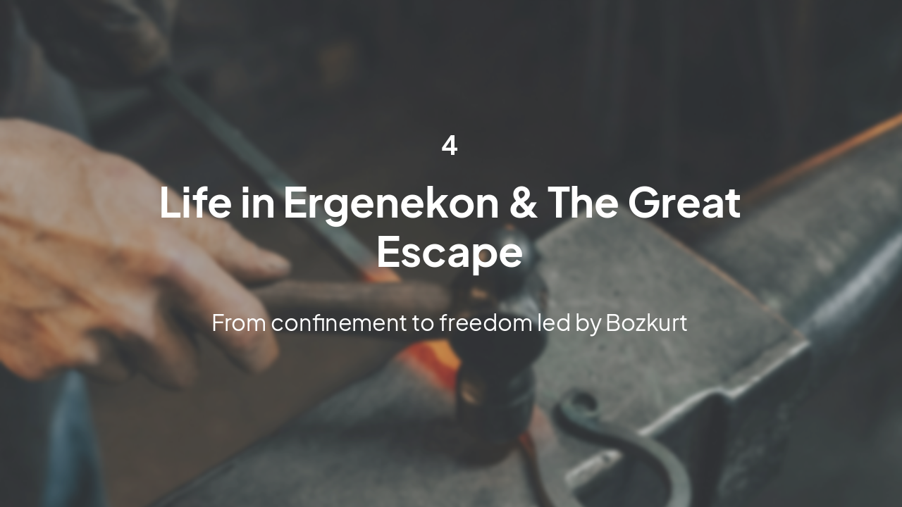 Ancient Past: Tribal Massacre Enemies destroy the tribe; sole survivor aided by she-wolf Generations Later: Attack and Flight New enemies force tribe into narrow Ergenekon valley; hidden for 400 years After 400 Years: Discovery Valley fills with people; find iron-rich mountain blocking exit **: Forging the Path Blacksmith melts iron mountain with bellows, creating a passage : The Guidance Gray wolf appears, leads the people through the pass to freedom Final Victory**: Rebirth of Empire Tribes emerge, defeat enemies, establish mighty khaganate