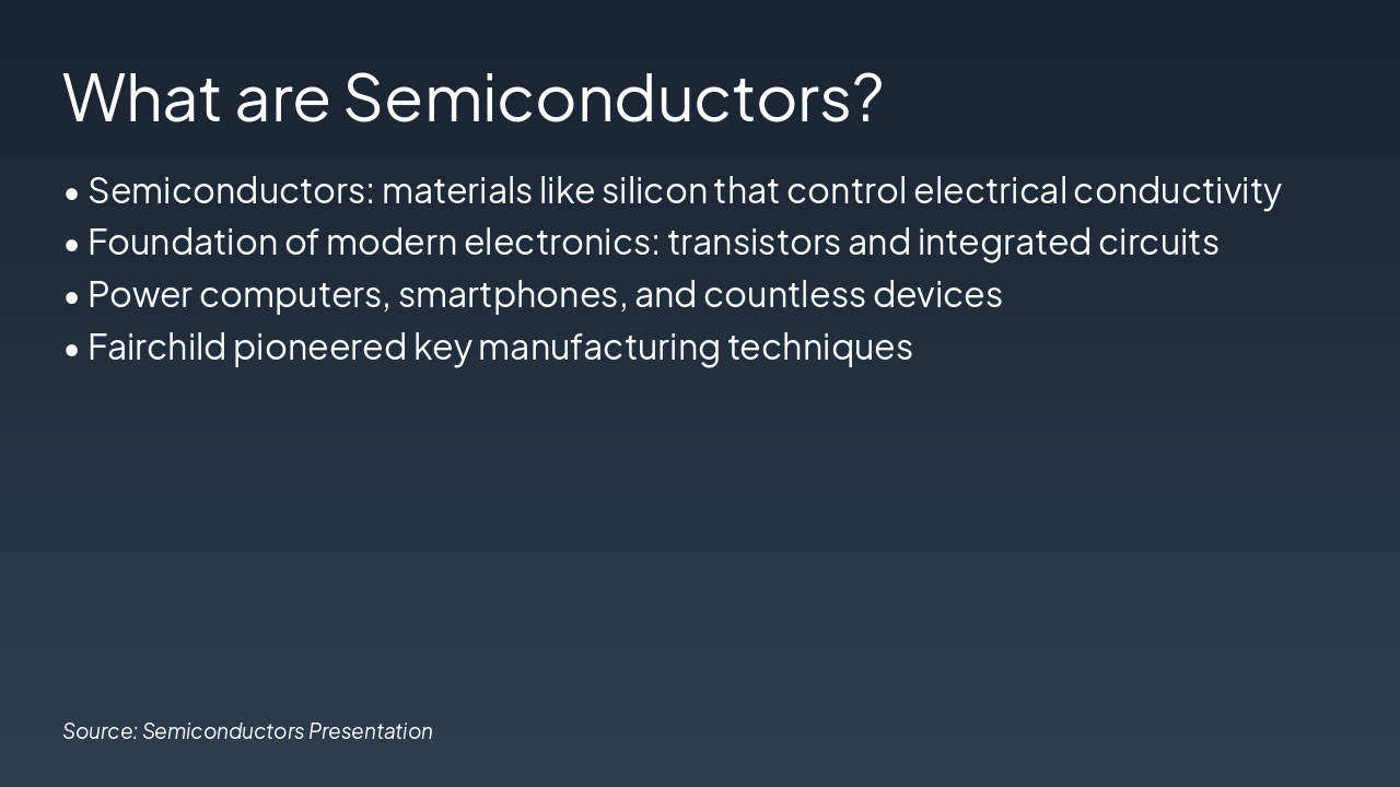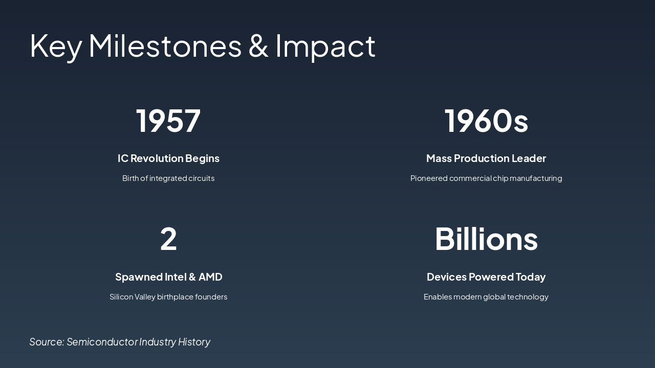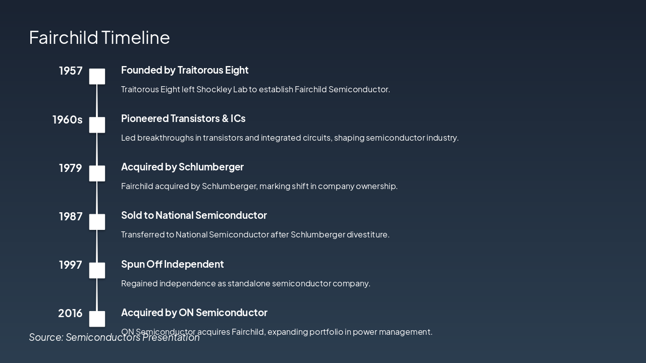 1957: Founded by Traitorous Eight Traitorous Eight left Shockley Lab to establish Fairchild Semiconductor. 1960s: Pioneered Transistors & ICs Led breakthroughs in transistors and integrated circuits, shaping semiconductor industry. 1979: Acquired by Schlumberger Fairchild acquired by Schlumberger, marking shift in company ownership. 1987: Sold to National Semiconductor Transferred to National Semiconductor after Schlumberger divestiture. 1997: Spun Off Independent Regained independence as standalone semiconductor company. 2016: Acquired by ON Semiconductor ON Semiconductor acquires Fairchild, expanding portfolio in power management.