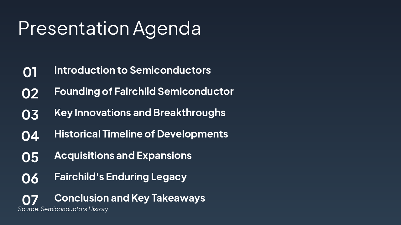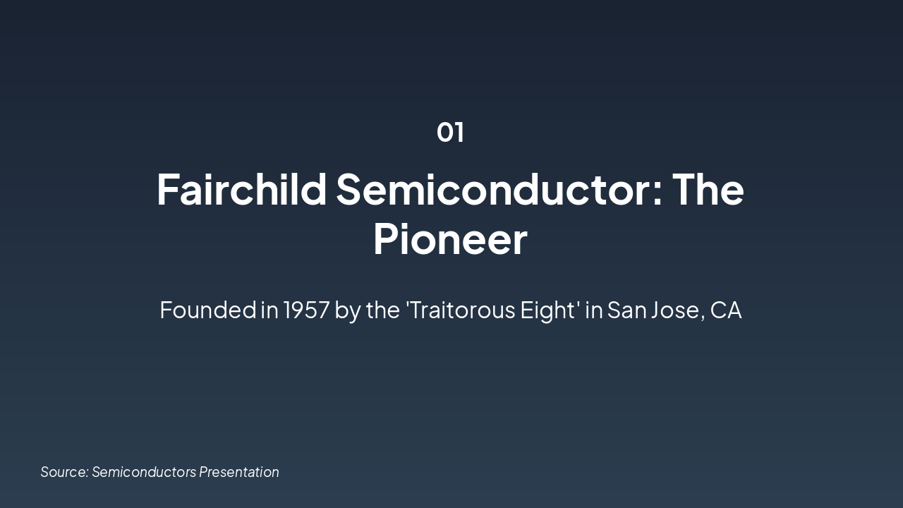 Fairchild Semiconductor was founded in 1957 by the Traitorous Eight after leaving Shockley Lab and pioneered transistors and ICs in the 1960s, shaping the industry. It underwent multiple ownership changes, including acquisitions by Schlumberger in 1979, National Semiconductor in 1987, a spin-off to independence in 1997, and finally ON Semiconductor in 2016.