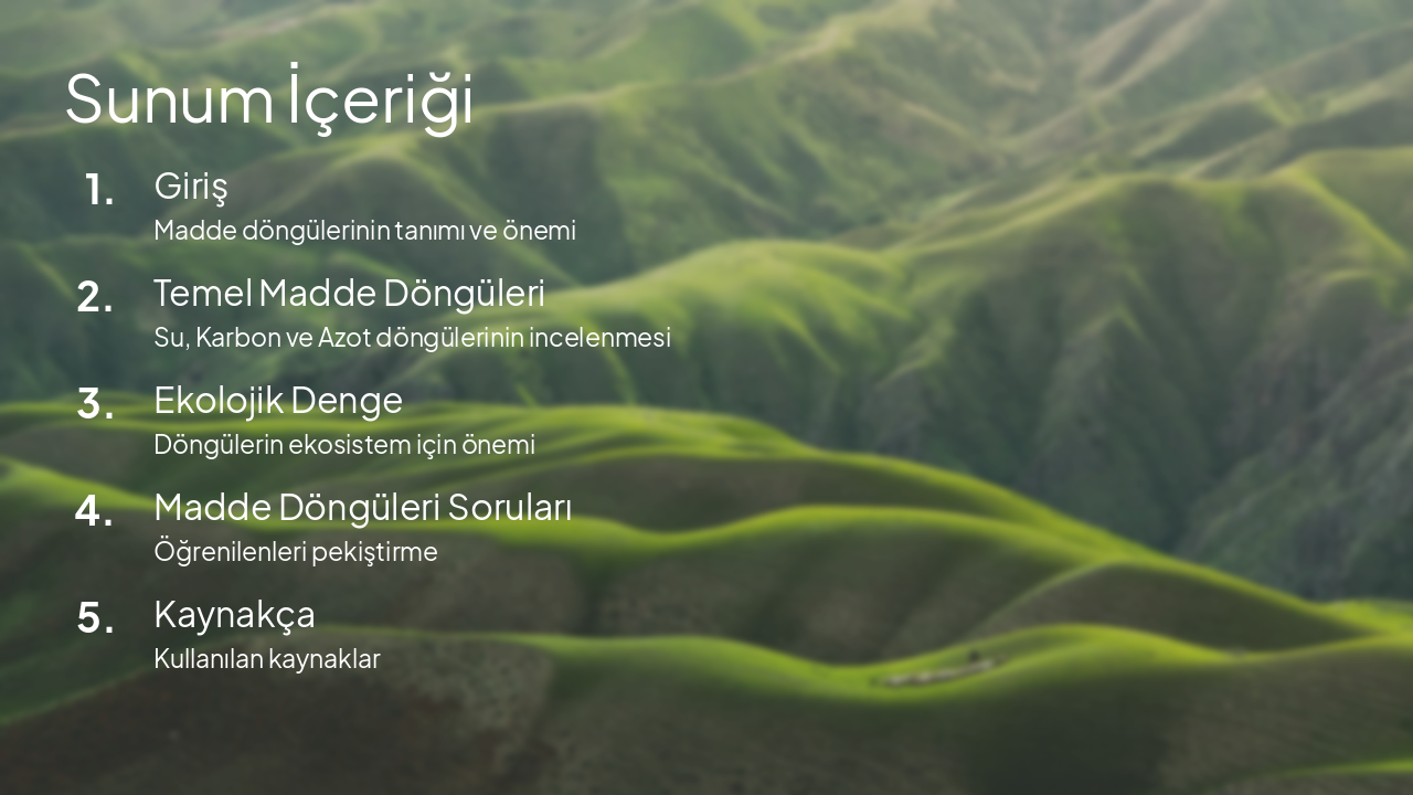 Madde döngülerinin tanımı, önemi ve temel örnekleri olan su, karbon ile azot döngüleri bu sunumda incelenmektedir. Ekosistemlerdeki ekolojik denge rolü, pekiştirme soruları ve kaynakça ile doğanın devamlılığı vurgulanmaktadır.