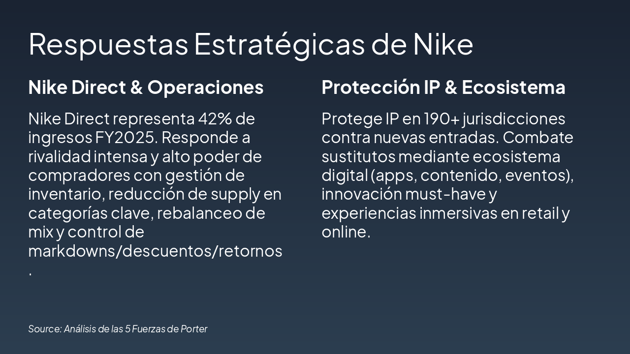 How Nike has responded: Nike describes its strategic answer as leading with sport, creating must-have innovation, building personal connections with consumers, and delivering consumer experiences through digital and retail. Operationally, Nike also describes marketplace actions such as reducing supply in certain footwear categories, rebalancing the product mix toward newer/innovative product, and actively managing inventory via markdown/discount/returns to create space for new launches, while reinvesting in wholesale and adjusting its digital positioning.