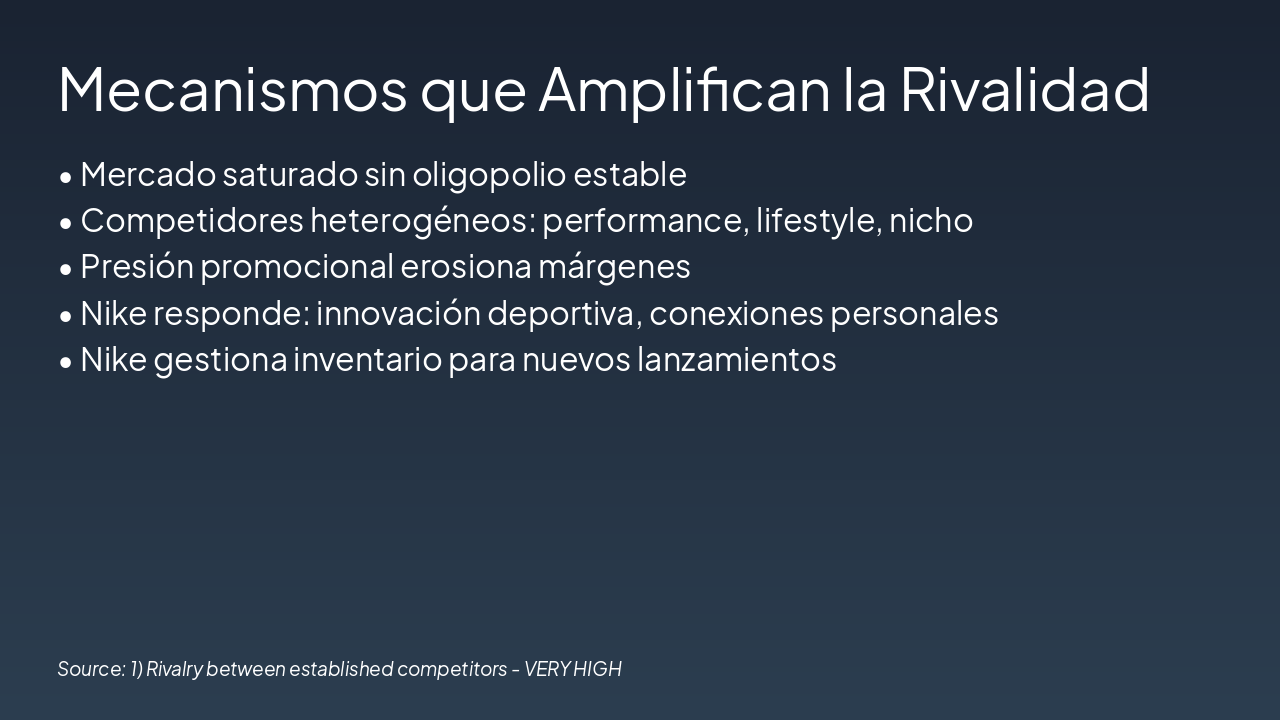 First, the market is crowded, meaning competitive intensity is not naturally “contained” by a stable oligopoly; multiple relevant players fight for attention and shelf space, and challenger brands can scale faster than in the past. Second, competitors are highly heterogeneous (performance-first, lifestyle-first, niche specialists, value players), which increases friction because players attack different pockets of demand and force continuous repositioning. Third, when demand weakens or assortments misalign, rivalry often turns into promotional pressure (markdowns, discounts, returns), which compresses margins and forces brands to reset inventory to make room for new products.