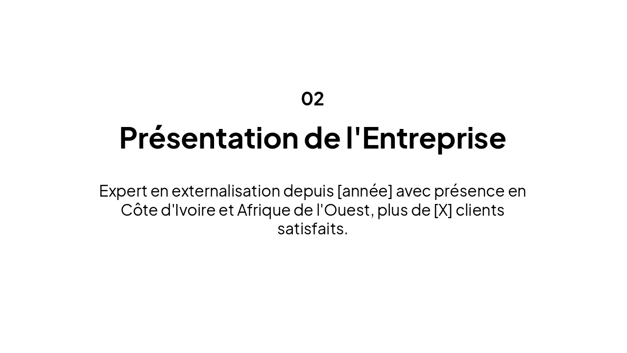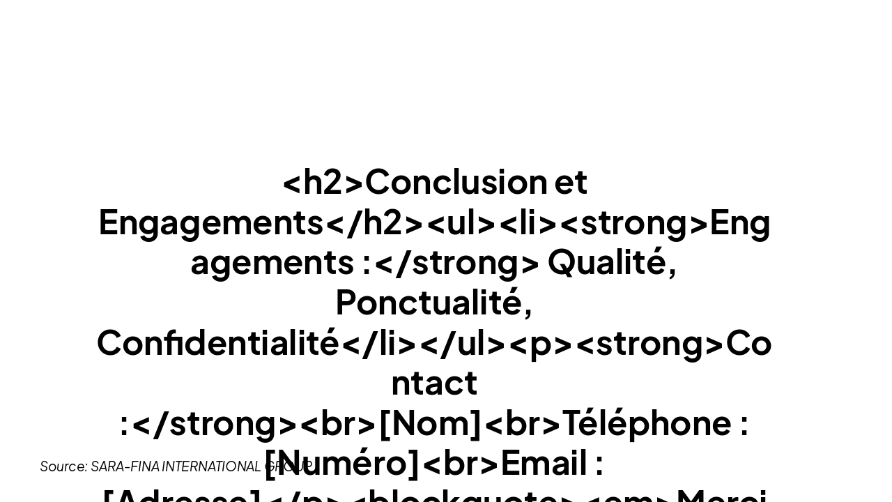 <h2>Conclusion et Engagements</h2><ul><li><strong>Engagements :</strong> Qualité, Ponctualité, Confidentialité</li></ul><p><strong>Contact :</strong><br>[Nom]<br>Téléphone : [Numéro]<br>Email : [Adresse]</p><blockquote><em>Merci pour votre confiance.</em></blockquote><p><strong>Message de clôture :</strong> Partenariat réussi assuré.</p><p><strong>Appel à l'action :</strong> Contactez-nous pour démarrer la collaboration dès aujourd'hui.</p>