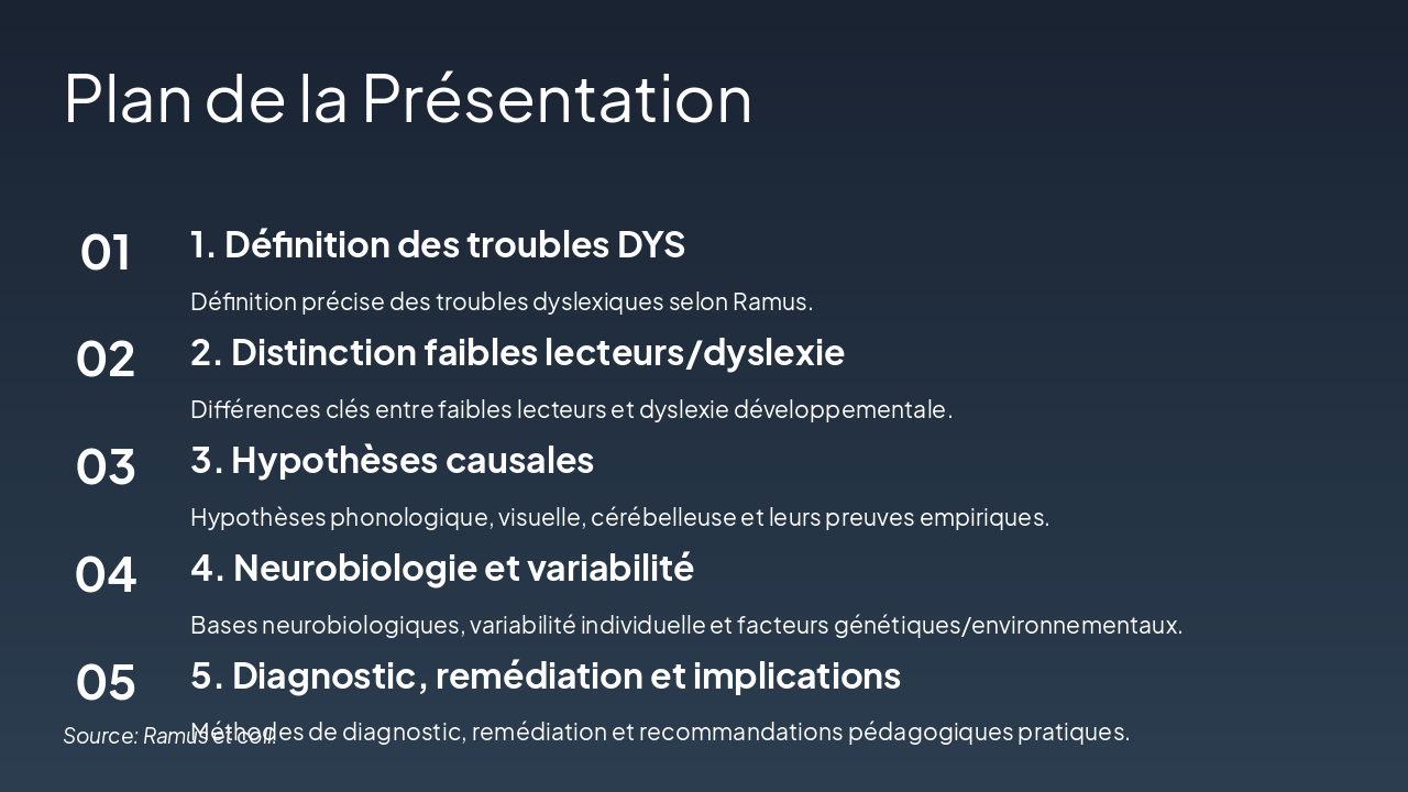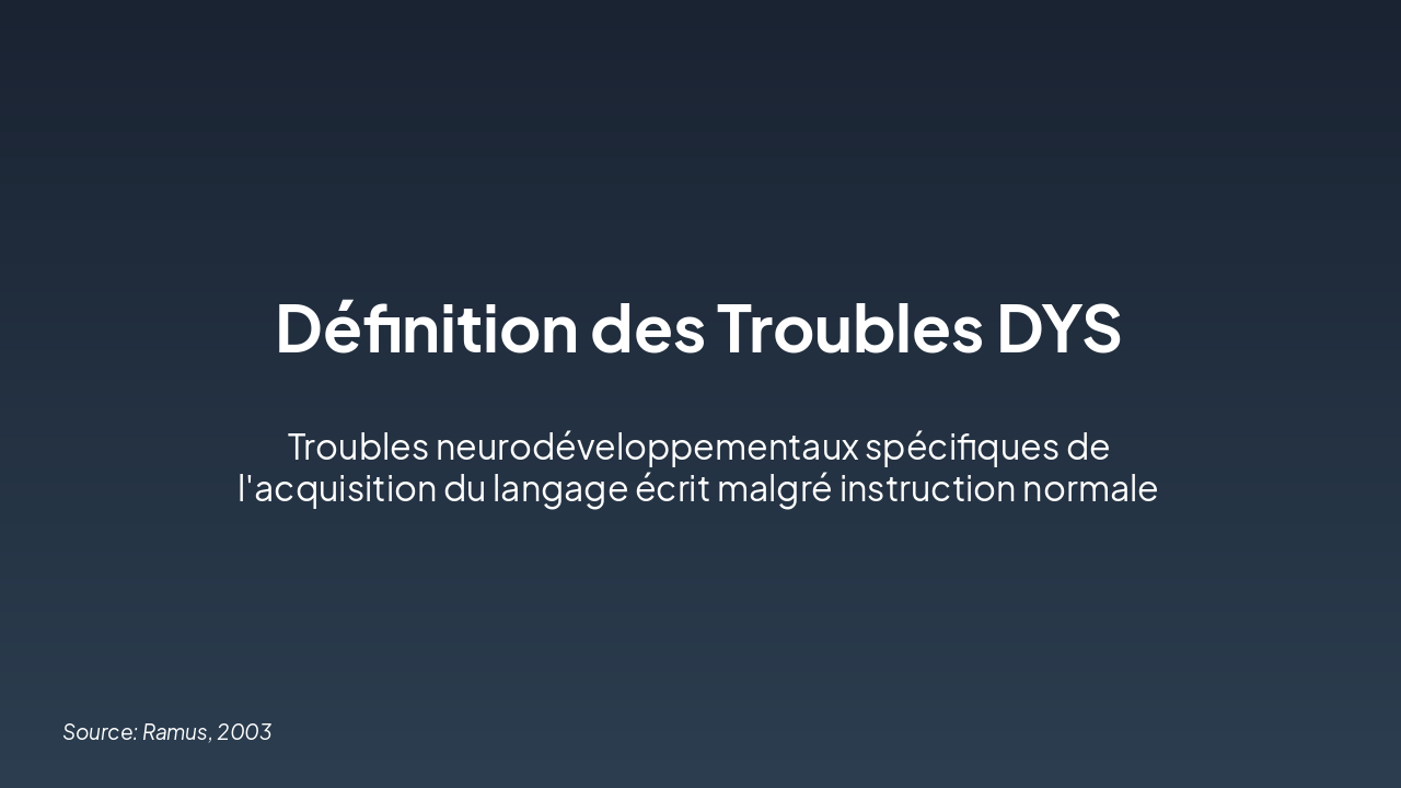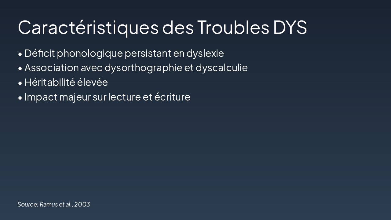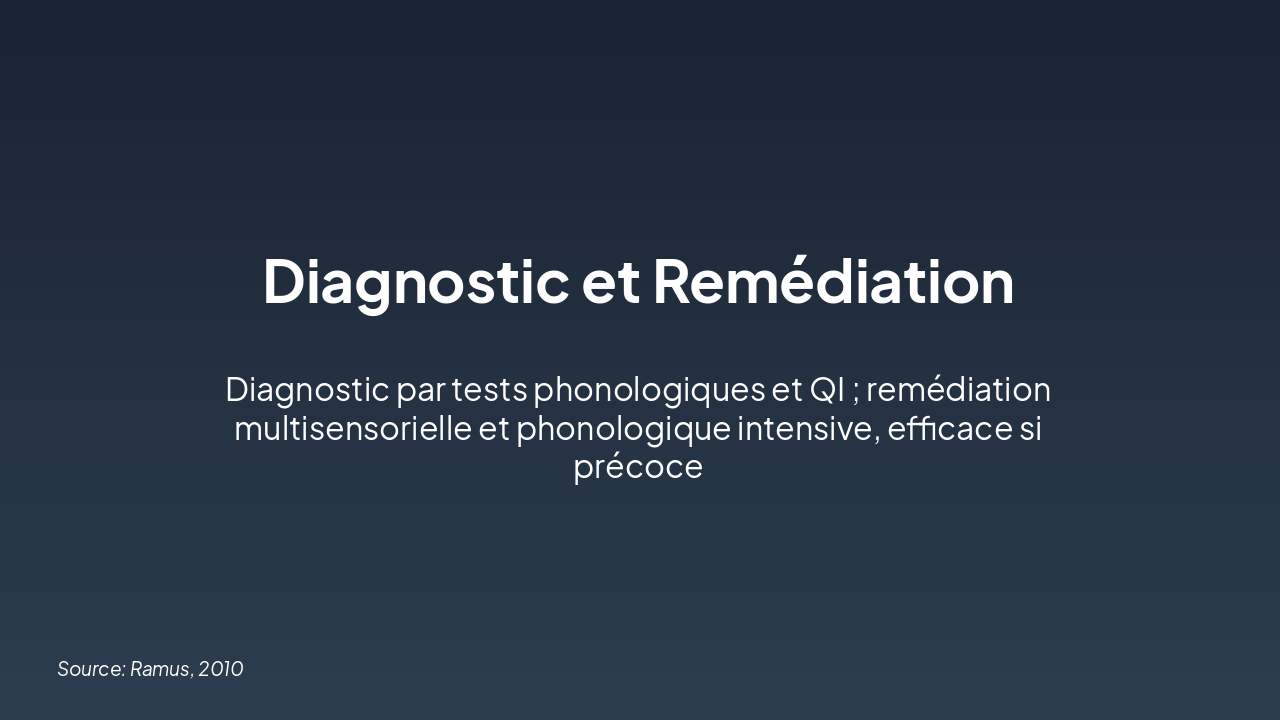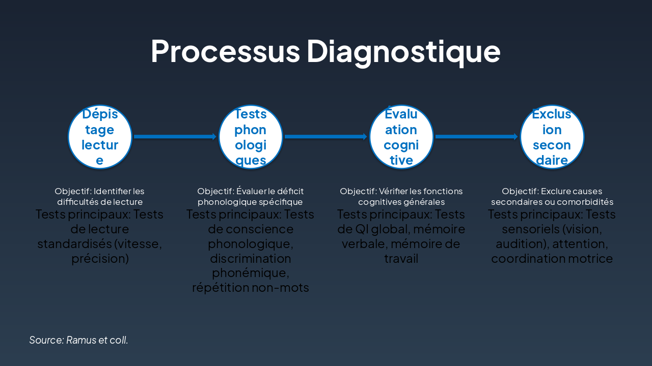 Processus diagnostique séquentiel des troubles DYS selon Ramus et al. : dépistage initial, confirmation du déficit phonologique, évaluation cognitive et exclusion des comorbidités ou causes alternatives.