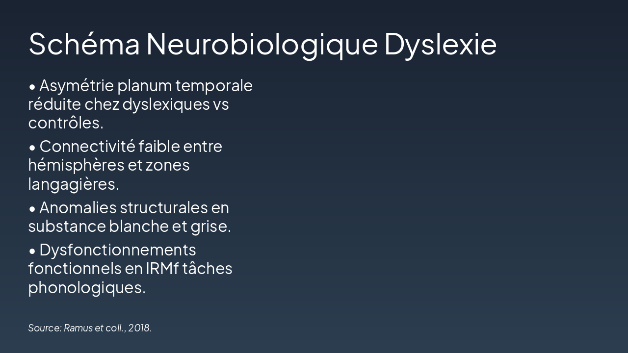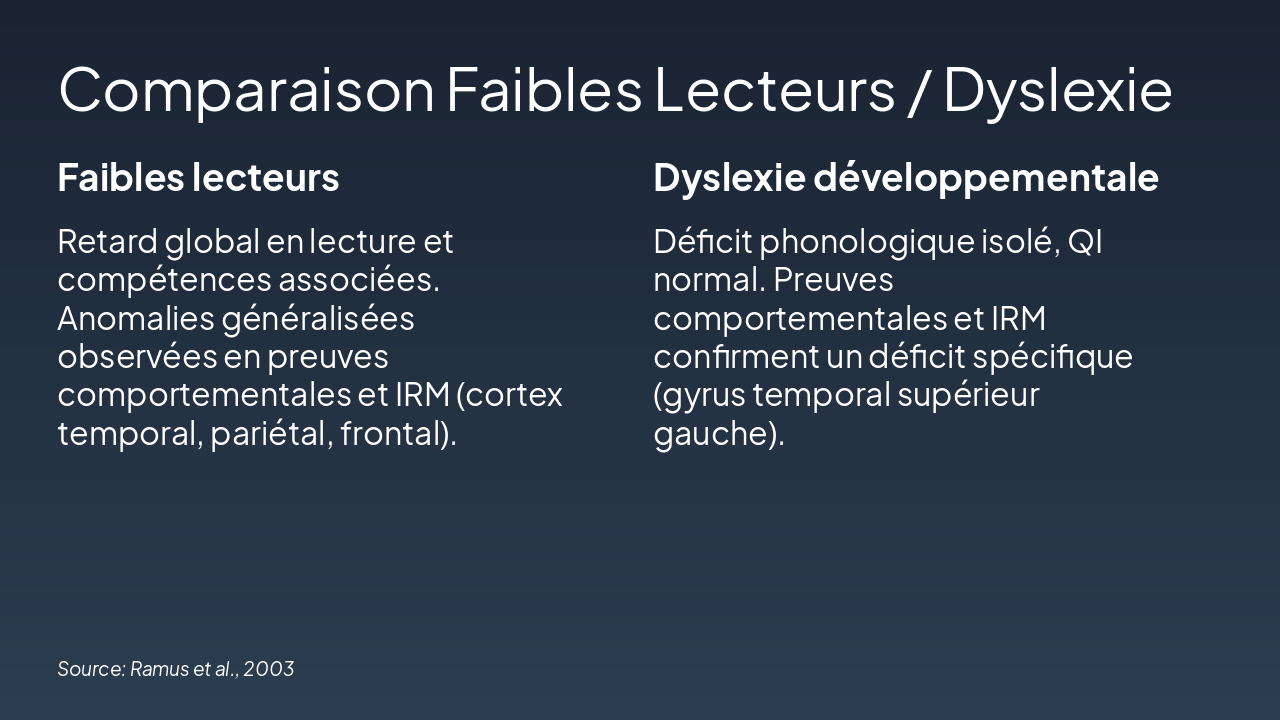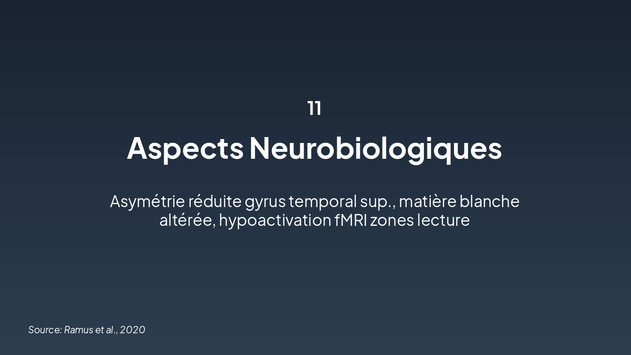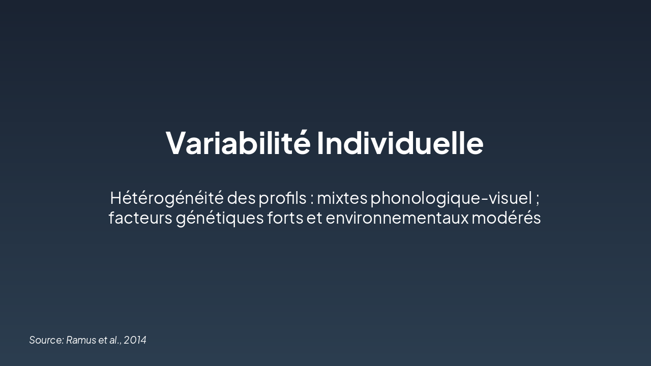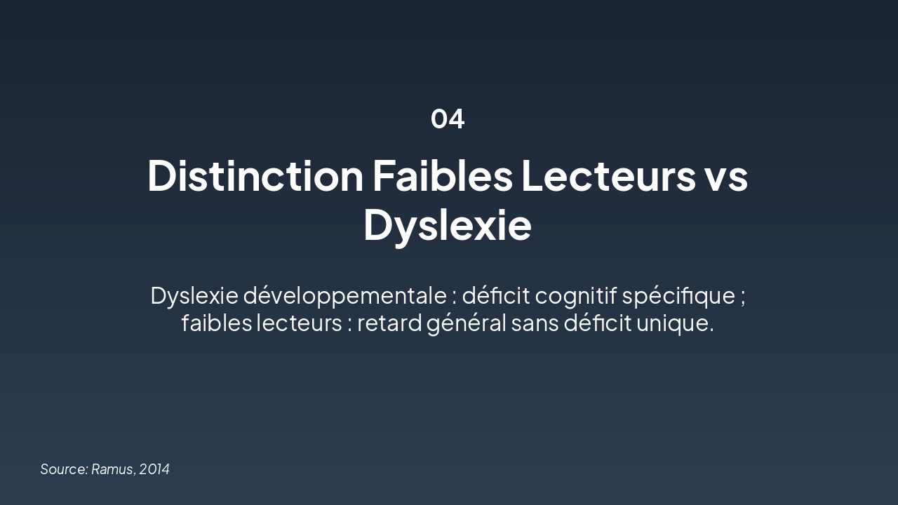 { "headers": [ "Étape", "Objectif", "Tests principaux" ], "rows": [ [ "Dépistage lecture", "Identifier les difficultés de lecture", "Tests de lecture standardisés (vitesse, précision)" ], [ "Tests phonologiques", "Évaluer le déficit phonologique spécifique", "Tests de conscience phonologique, discrimination phonémique, répétition non-mots" ], [ "Évaluation cognitive", "Vérifier les fonctions cognitives générales", "Tests de QI global, mémoire verbale, mémoire de travail" ], [ "Exclusion secondaire", "Exclure causes secondaires ou comorbidités", "Tests sensoriels (vision, audition), attention, coordination motrice" ] ] }