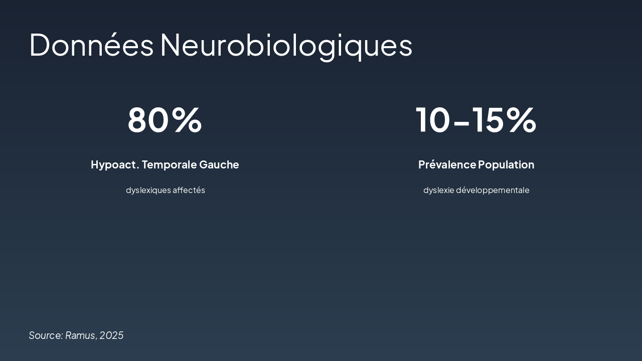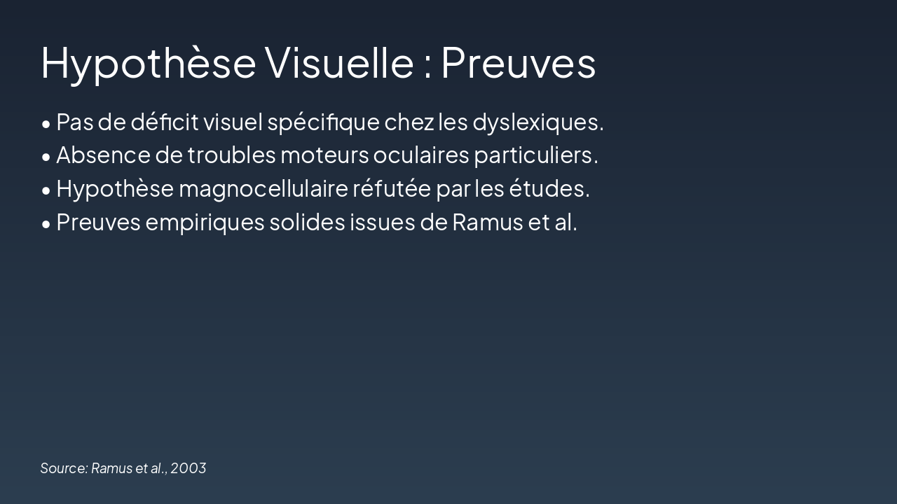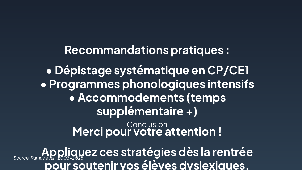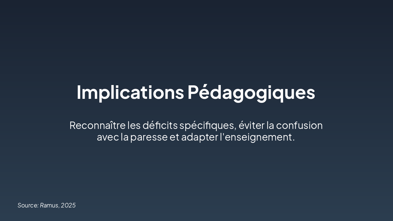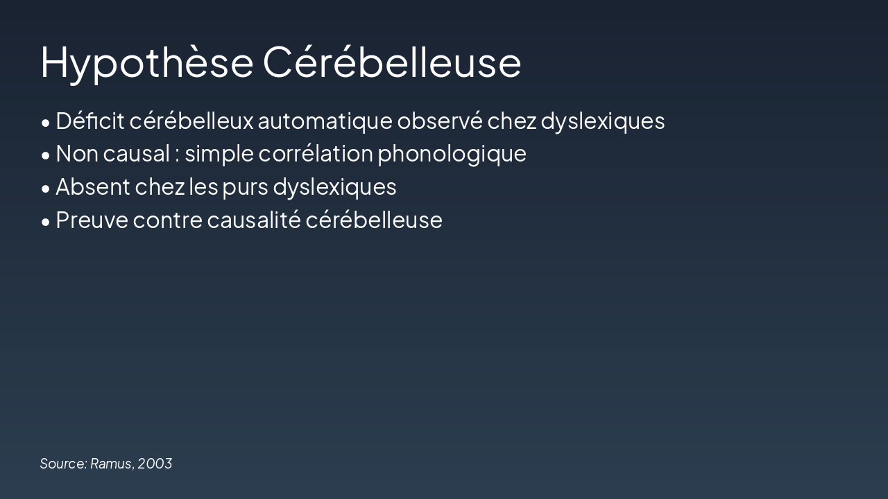 { "headers": [ "Étape", "Objectif", "Tests principaux" ], "rows": [ [ "Dépistage lecture", "Identifier les difficultés de lecture", "Tests de lecture standardisés (vitesse, précision)" ], [ "Tests phonologiques", "Évaluer le déficit phonologique spécifique", "Tests de conscience phonologique, discrimination phonémique, répétition non-mots" ], [ "Évaluation cognitive", "Vérifier les fonctions cognitives générales", "Tests de QI global, mémoire verbale, mémoire de travail" ], [ "Exclusion secondaire", "Exclure causes secondaires ou comorbidités", "Tests sensoriels (vision, audition), attention, coordination motrice" ] ] }
