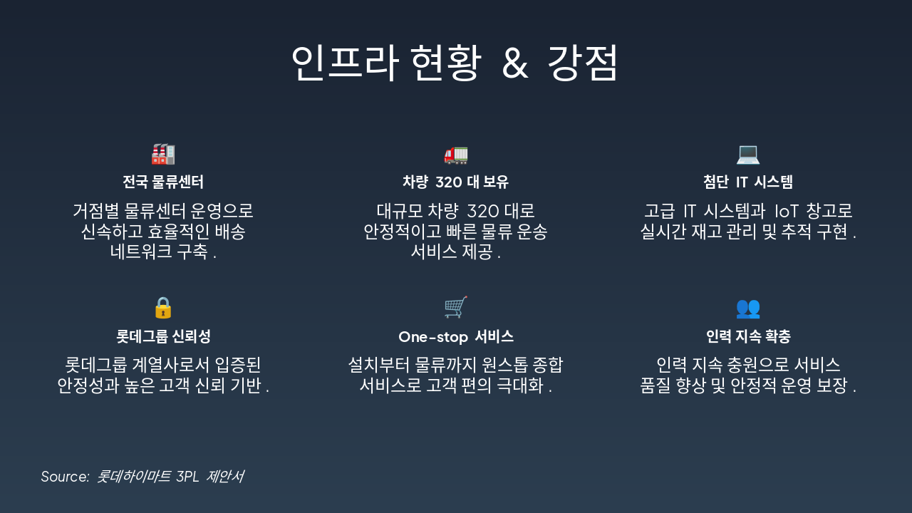 이 슬라이드는 전국 물류센터, 320대 차량 보유, 첨단 IT 시스템 등 인프라 현황과 강점을 6가지 아이콘으로 강조한다. 롯데그룹 신뢰성, 원스톱 서비스, 인력 확충을 통해 안정적이고 효율적인 물류 운영을 제시한다.