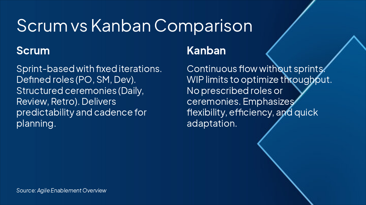 | Sprint-based with fixed iterations. Defined roles (PO, SM, Dev). Structured ceremonies (Daily, Review, Retro). Delivers predictability and cadence for planning. | Continuous flow without sprints. WIP limits to optimize throughput. No prescribed roles or ceremonies. Emphasizes flexibility, efficiency, and quick adaptation. |