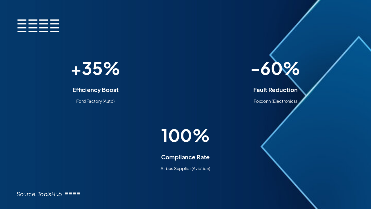 The "Why Choose ToolsHub" slide features a grid of five key advantages: real-time tool monitoring with instant alerts, AI predictive maintenance extending tool life by 40%, seamless integration with existing systems, enterprise-grade data security, and full Chinese localized support. These highlights emphasize efficiency, reliability, and user-friendly deployment for optimal operations.