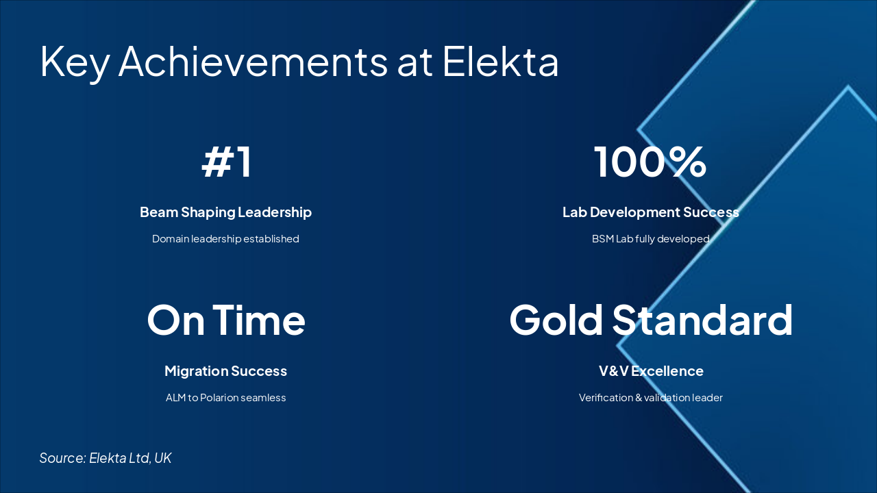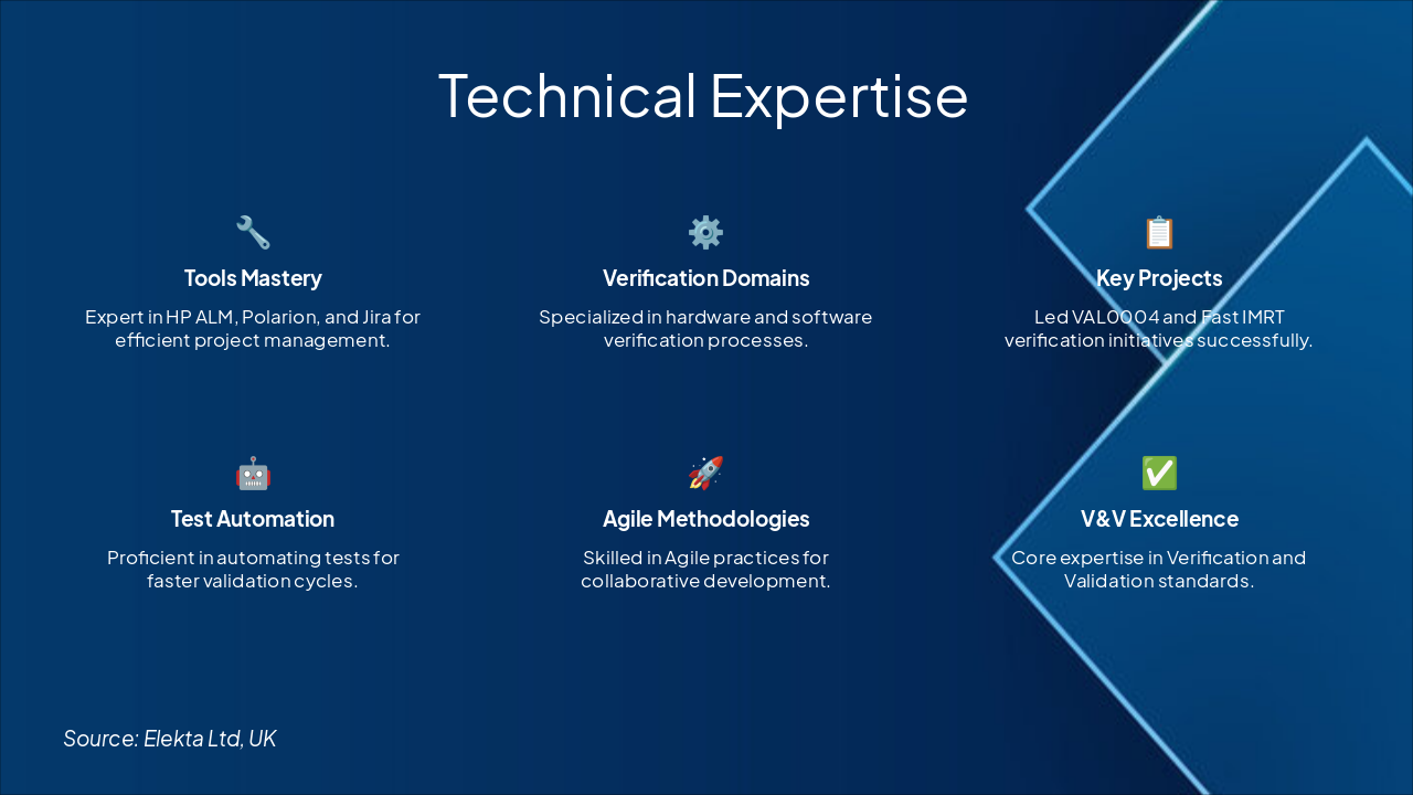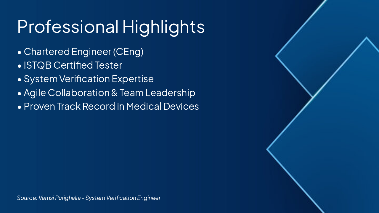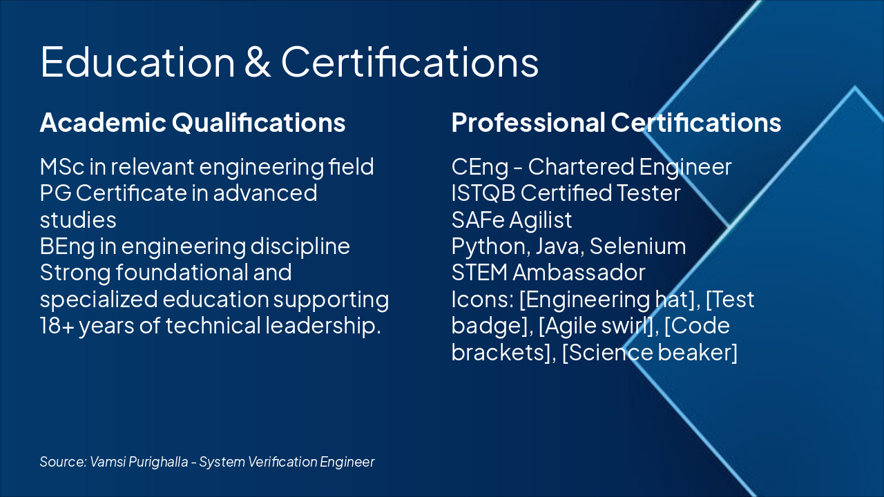 | MSc in relevant engineering field PG Certificate in advanced studies BEng in engineering discipline Strong foundational and specialized education supporting 18+ years of technical leadership. | CEng - Chartered Engineer ISTQB Certified Tester SAFe Agilist Python, Java, Selenium STEM Ambassador Icons: [Engineering hat], [Test badge], [Agile swirl], [Code brackets], [Science beaker] |