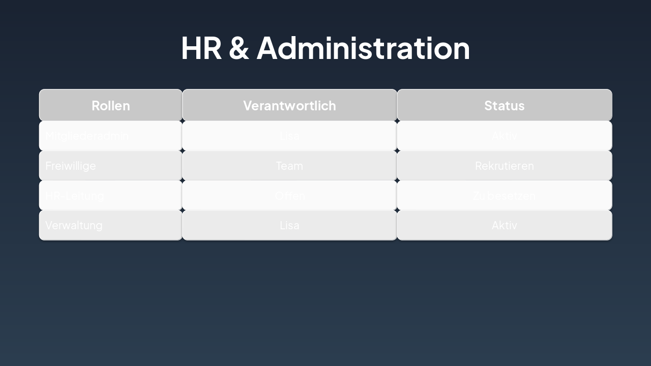 { "headers": [ "Prozessschritt", "Verantwortlicher", "Geplante Dauer", "Erwartetes Ergebnis" ], "rows": [ [ "Statuten prüfen & aktualisieren", "Vorstandsvorsitzender", "1–2 Wochen", "Grundlage analysiert, Aktualisierungsbedarf identifiziert & Vorschlag erstellt" ], [ "Vorstandsreglemente erarbeiten", "Gesamter Vorstand", "2 Wochen", "Klare interne Regeln für Vorstandsarbeit & Rollenverteilung festgelegt" ], [ "Mitgliederversammlung & Beschlussfassung definieren", "Vorstand & Rechtsberater", "1 Woche", "Standardprozesse für Versammlungen und Entscheidungsfindung dokumentiert" ], [ "Compliance-Checks implementieren", "Compliance-Beauftragter", "fortlaufend", "Regelmäßige Kontrollen eingerichtet, Risiken minimiert" ] ] }
