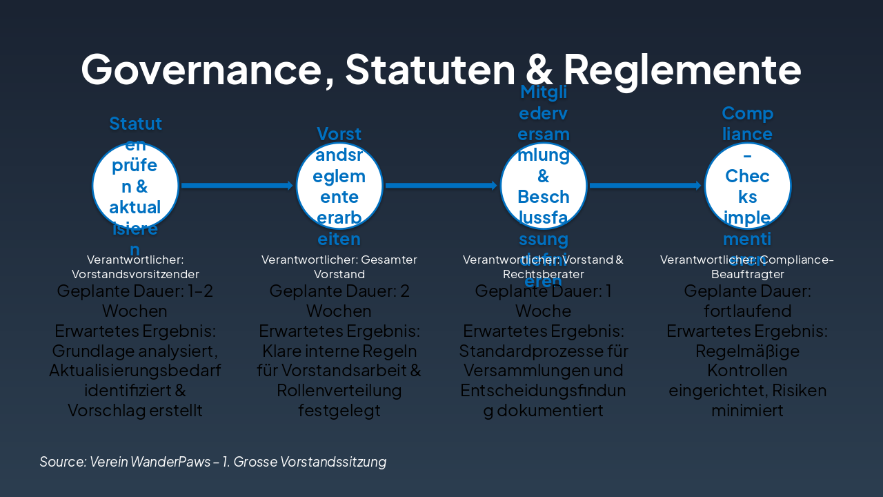Dieser Workflow bietet eine klare, strukturierte Roadmap für die Optimierung der Governance-Strukturen. Ziel: Entscheidungsgrundlage schaffen für saubere Vereinsführung. Diskutieren Sie Zuweisungen, Fristen und offene Fragen (z. B. Statuten-Aktualisierung).