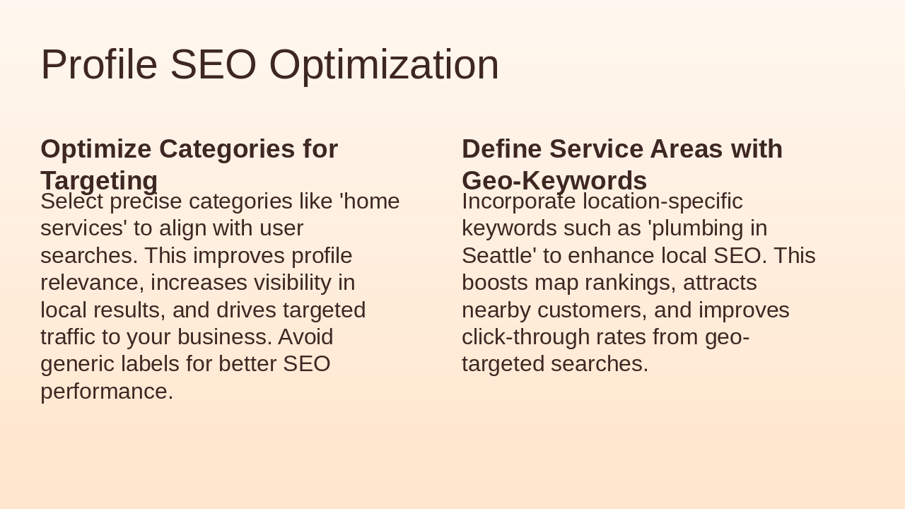 Profile categories, service areas, and keyword enhancements.