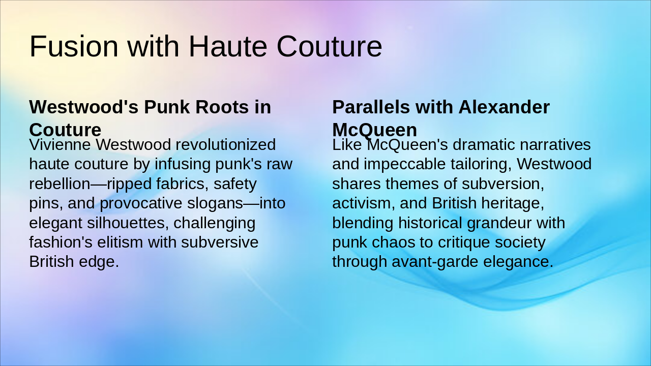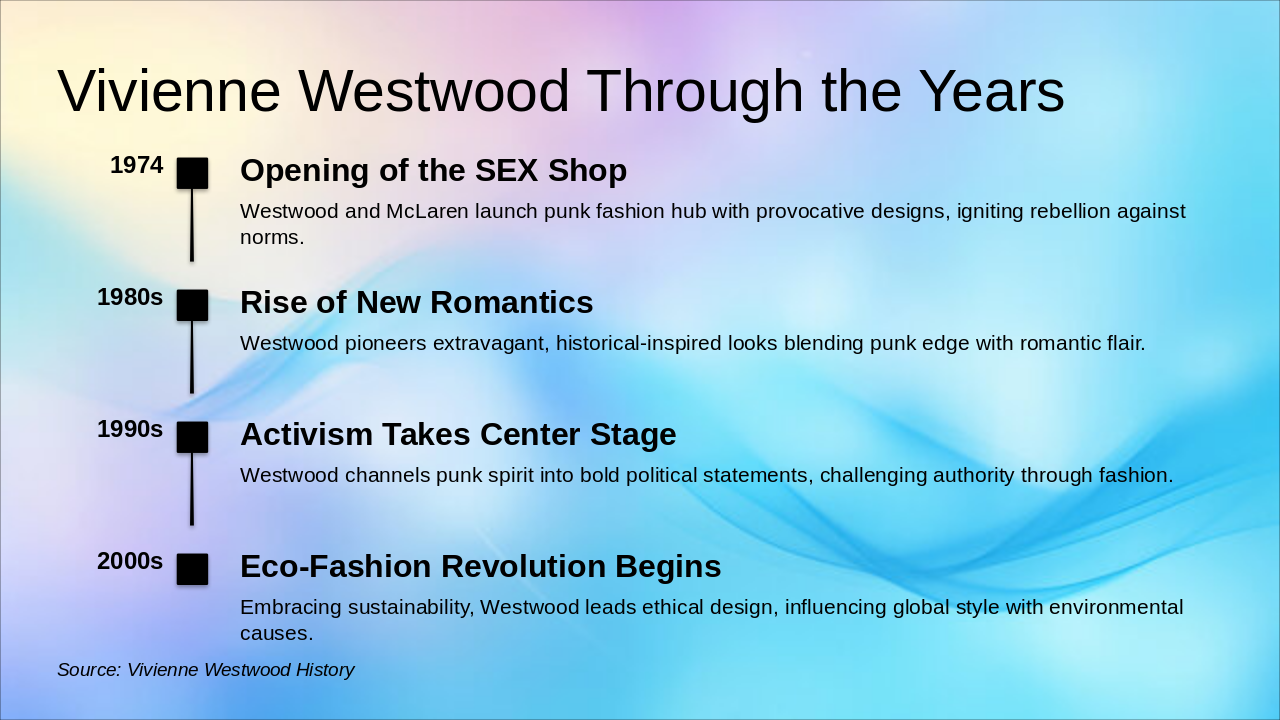 Vivienne Westwood's enduring legacy as a punk pioneer and activist icon blends avant-garde chaos with timeless elegance, inspiring us to redefine fashion with purpose. The slide's subtitle echoes her mantra, "Buy less, choose well," urging us to embrace chaos by rebelling in style, honoring the planet, and prioritizing quality over excess.