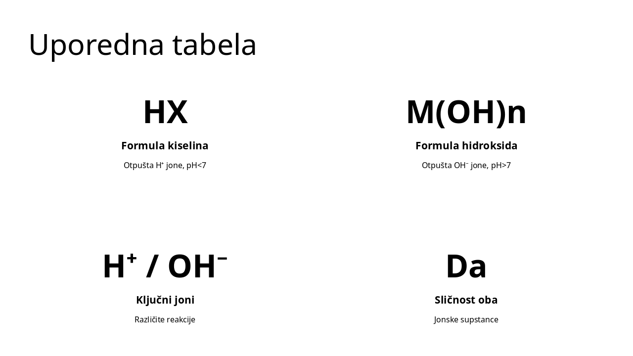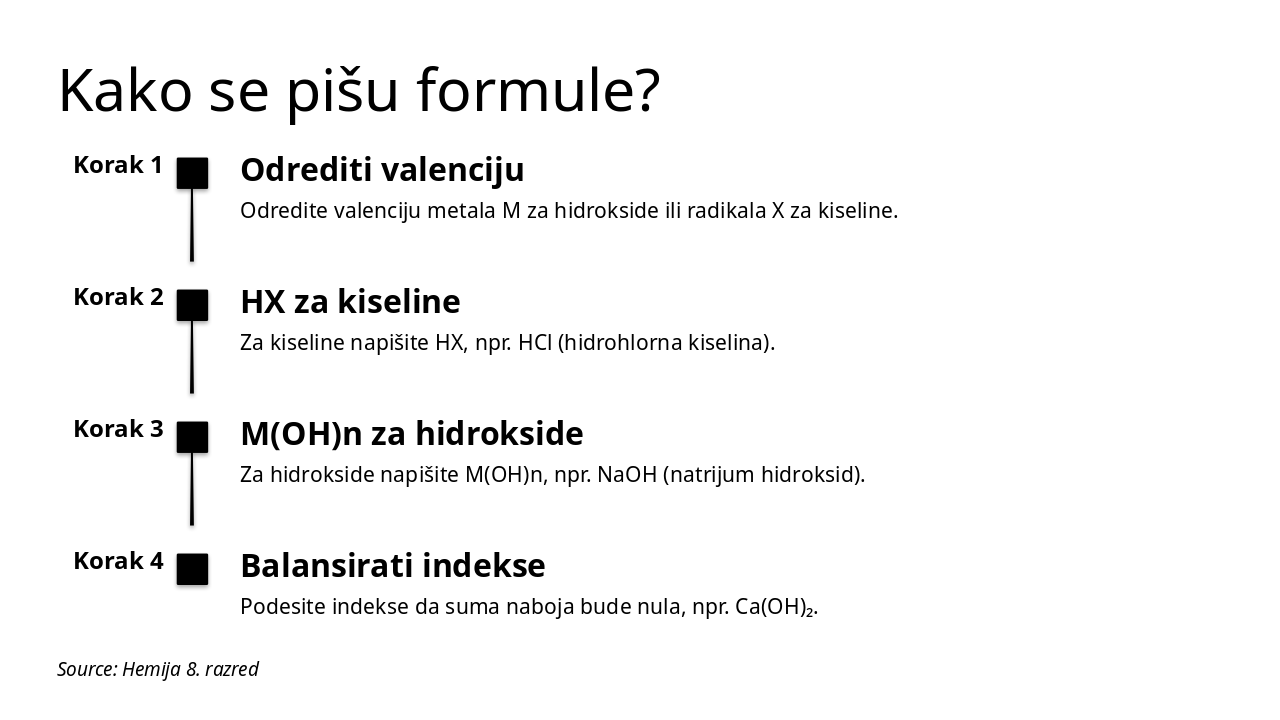 Korak 1: Odrediti valenciju Odredite valenciju metala M za hidrokside ili radikala X za kiseline. Korak 2: HX za kiseline Za kiseline napišite HX, npr. HCl (hidrohlorna kiselina). Korak 3: M(OH)n za hidrokside Za hidrokside napišite M(OH)n, npr. NaOH (natrijum hidroksid). Korak 4: Balansirati indekse Podesite indekse da suma naboja bude nula, npr. Ca(OH)₂.