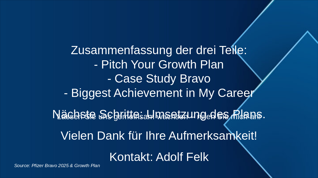 The slide is a title page for "Pfizer Bravo 2025 & Growth Plan," introducing an overview of Pfizer's growth strategies and achievements. It is presented by Adolf Felk, with a welcome message in German: "Präsentation von Adolf Felk. Willkommen zur Übersicht über Wachstumsstrategien und Erfolge bei Pfizer."