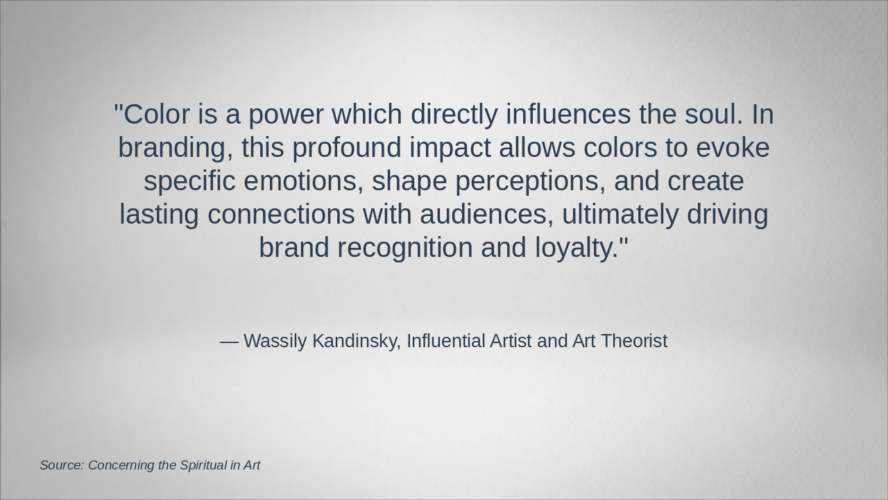 The slide, titled "Expert Insights," features a quote from influential artist and art theorist Wassily Kandinsky. It states that color powerfully influences the soul, enabling brands to evoke emotions, shape perceptions, foster connections, and build recognition and loyalty.