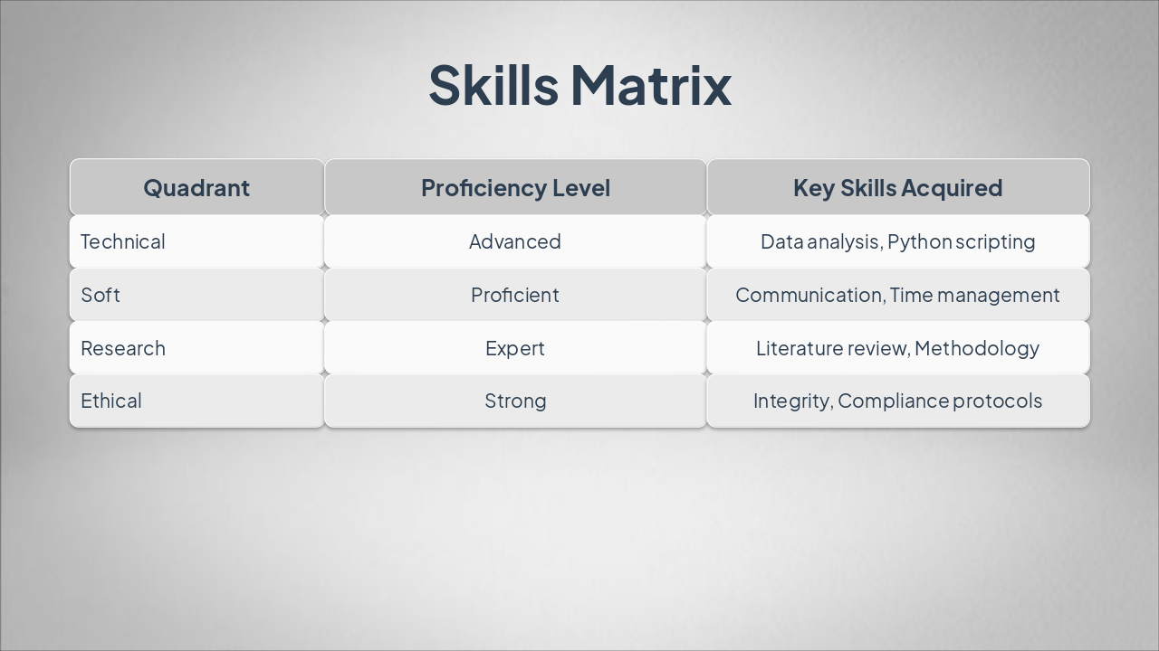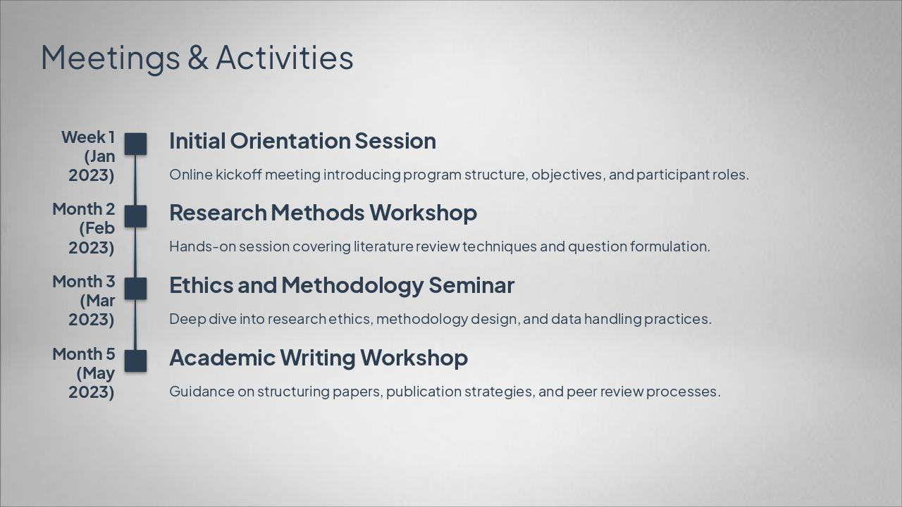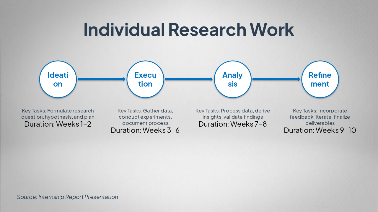 { "headers": [ "Phase", "Key Tasks", "Duration" ], "rows": [ [ "Ideation", "Formulate research question, hypothesis, and plan", "Weeks 1-2" ], [ "Execution", "Gather data, conduct experiments, document process", "Weeks 3-6" ], [ "Analysis", "Process data, derive insights, validate findings", "Weeks 7-8" ], [ "Refinement", "Incorporate feedback, iterate, finalize deliverables", "Weeks 9-10" ] ] }