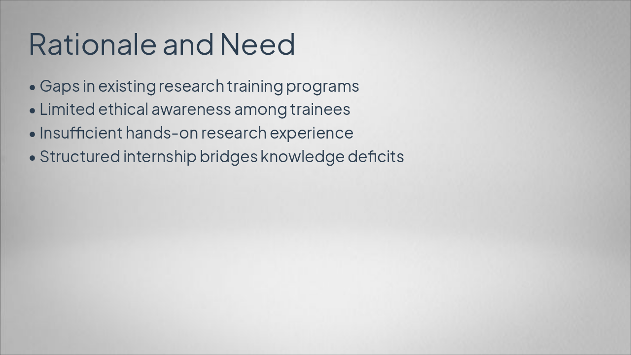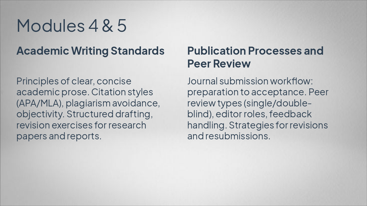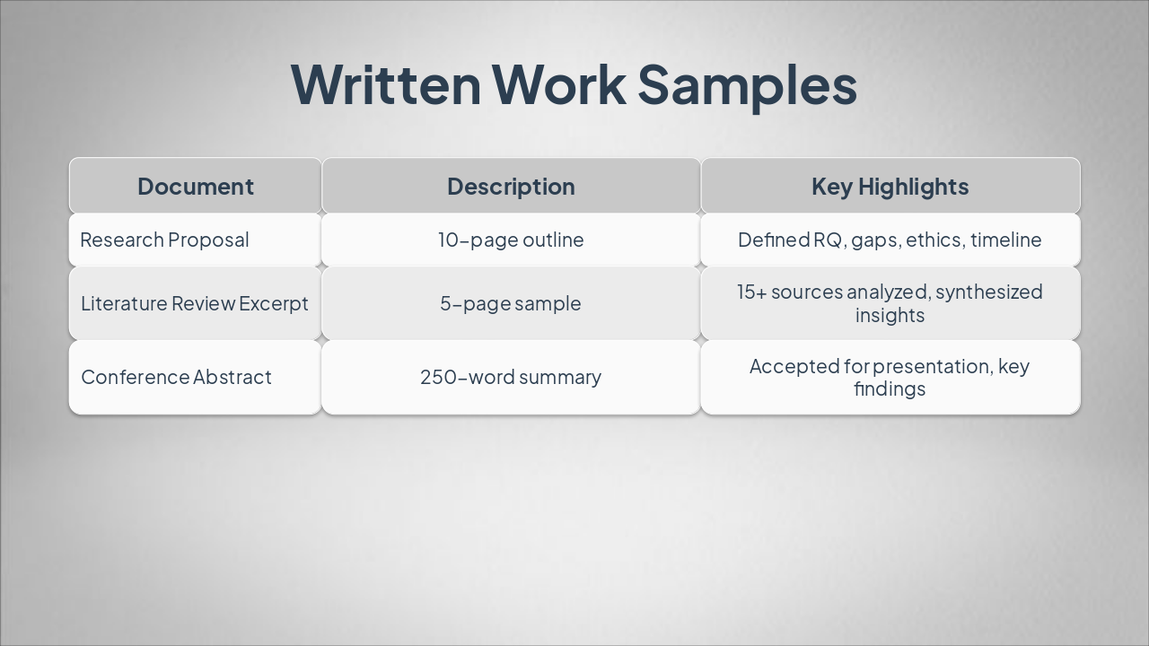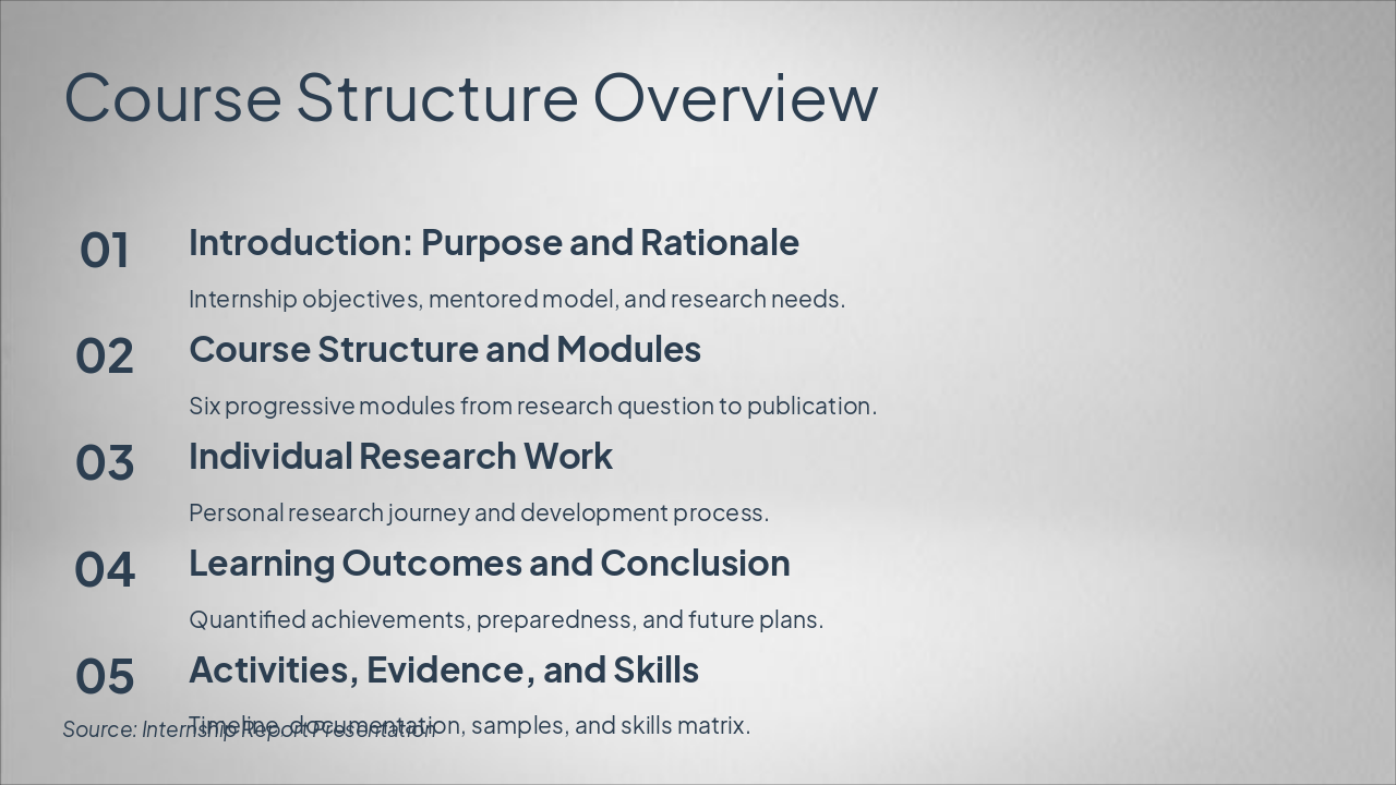 { "headers": [ "Phase", "Key Tasks", "Duration" ], "rows": [ [ "Ideation", "Formulate research question, hypothesis, and plan", "Weeks 1-2" ], [ "Execution", "Gather data, conduct experiments, document process", "Weeks 3-6" ], [ "Analysis", "Process data, derive insights, validate findings", "Weeks 7-8" ], [ "Refinement", "Incorporate feedback, iterate, finalize deliverables", "Weeks 9-10" ] ] }