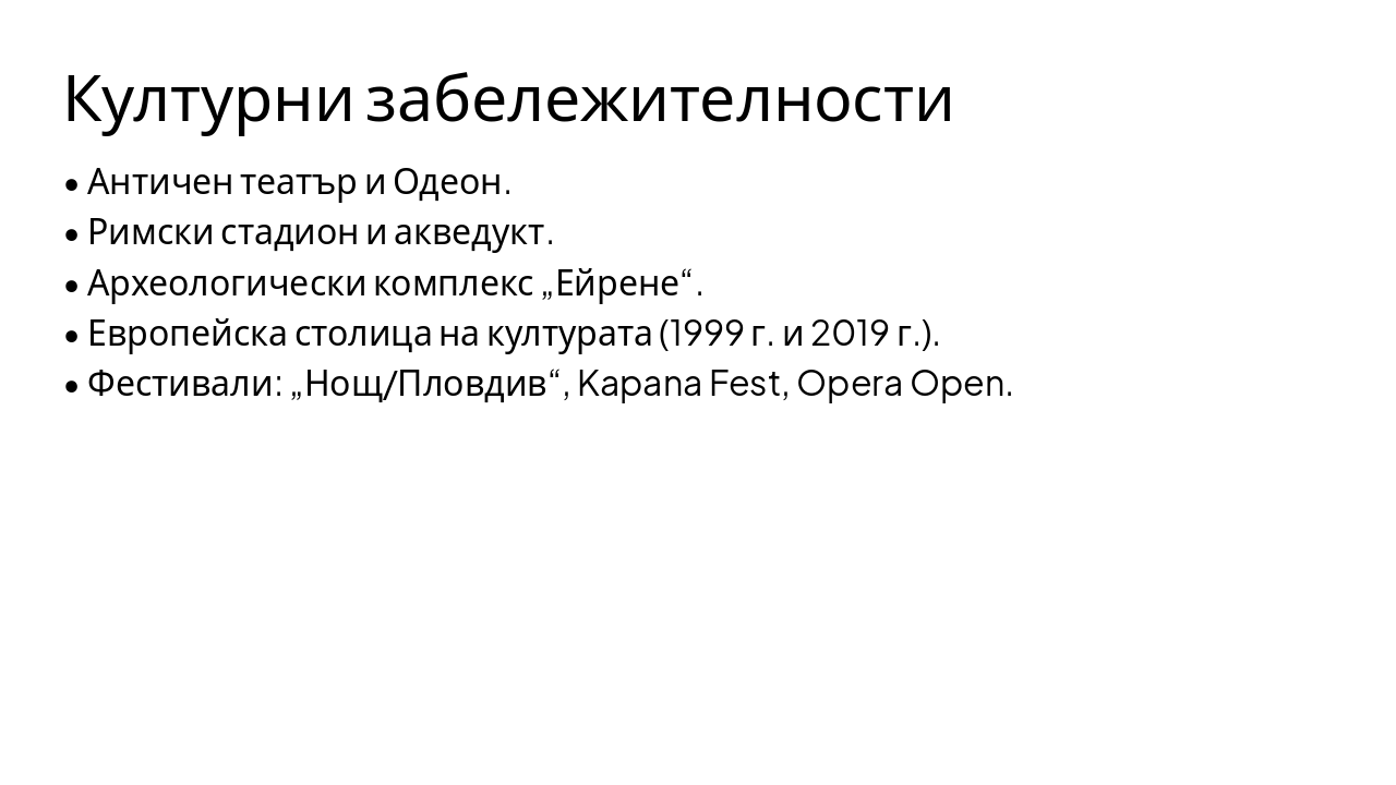 Презентация за историята на Пловдив – един от най-старите градове в Европа: от неолита и тракийското наследство, през културни забележителности като Античния театър и Римския стадион, до съвременния живот със спорт, фестивали и международно летище.