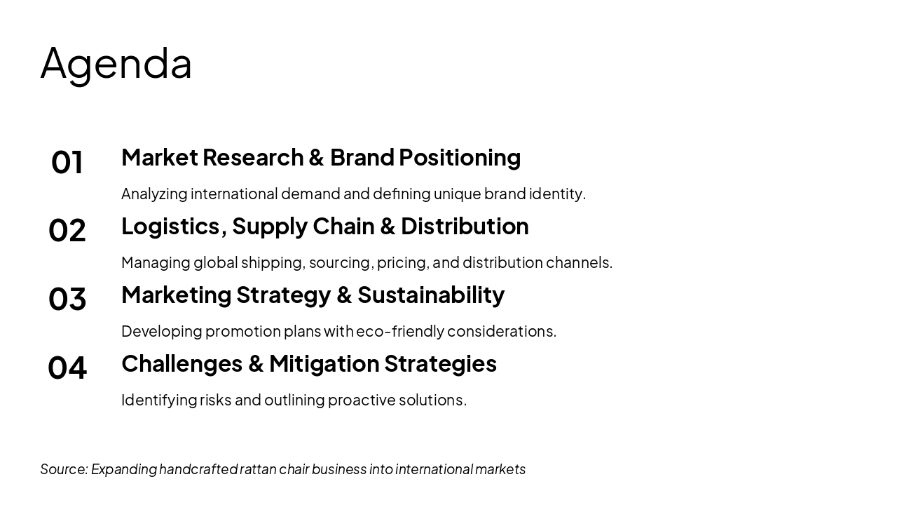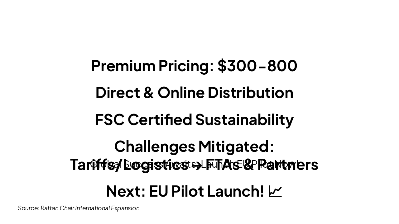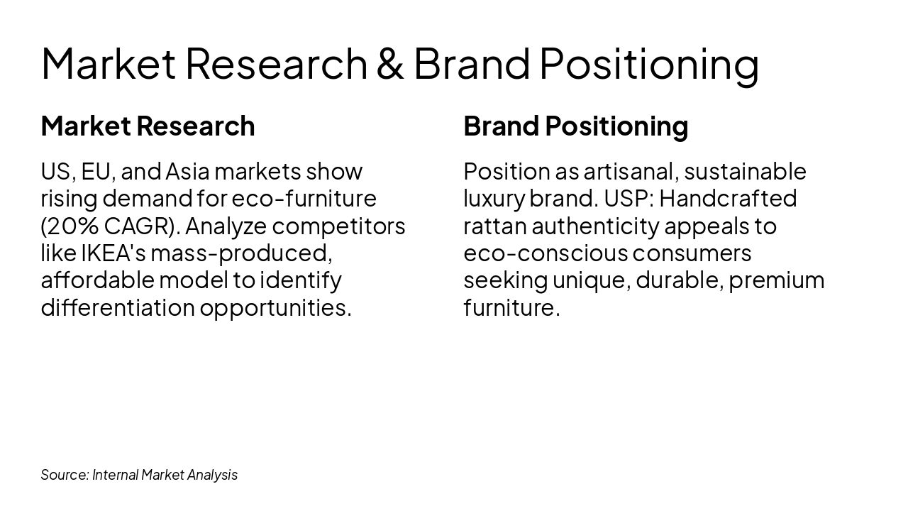 { "headers": [ "Phase", "Owner", "Duration", "Key Actions" ], "rows": [ [ "Sustainable Rattan Sourcing", "Supply Chain Manager", "Ongoing", "Partner with certified suppliers in Southeast Asia to ensure ethical, sustainable materials." ], [ "Efficient Intl Shipping Partners", "Logistics Lead", "2-4 weeks", "Negotiate rates with DHL/FedEx for reliable, cost-effective global delivery." ], [ "Digital Campaigns", "Marketing Team", "Monthly", "Launch Instagram ads and influencer collabs targeting EU/US audiences." ], [ "E-com Platforms for Reach", "E-commerce Specialist", "1 month", "Optimize listings on Etsy, Amazon, and Shopify for international sales." ] ] }