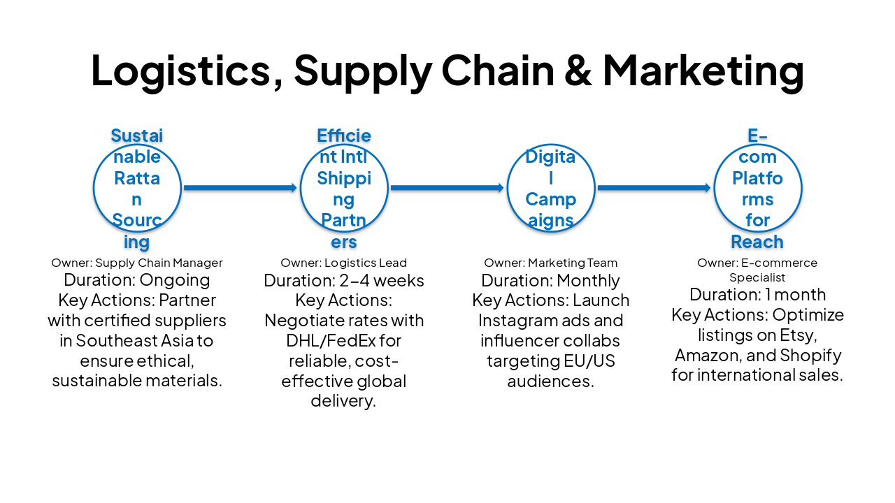 The slide outlines a workflow for Logistics, Supply Chain, and Marketing, with phases including sustainable rattan sourcing, efficient international shipping, digital campaigns, and e-commerce optimization. Each phase specifies the owner, duration (ongoing to 1 month), and key actions like partnering with suppliers and launching Instagram ads.