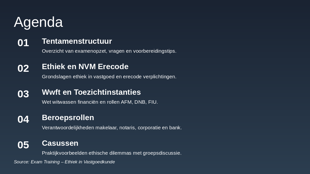 The agenda slide outlines key topics for a session on real estate ethics and regulations, starting with an overview of the exam structure, including setup, questions, and preparation tips. It continues with discussions on ethics and the NVM code of honor, anti-money laundering laws (Wwft) and supervisory bodies like AFM, DNB, and FIU, professional roles of brokers, notaries, housing corporations, and banks, and ends with case studies featuring ethical dilemmas and group discussions.