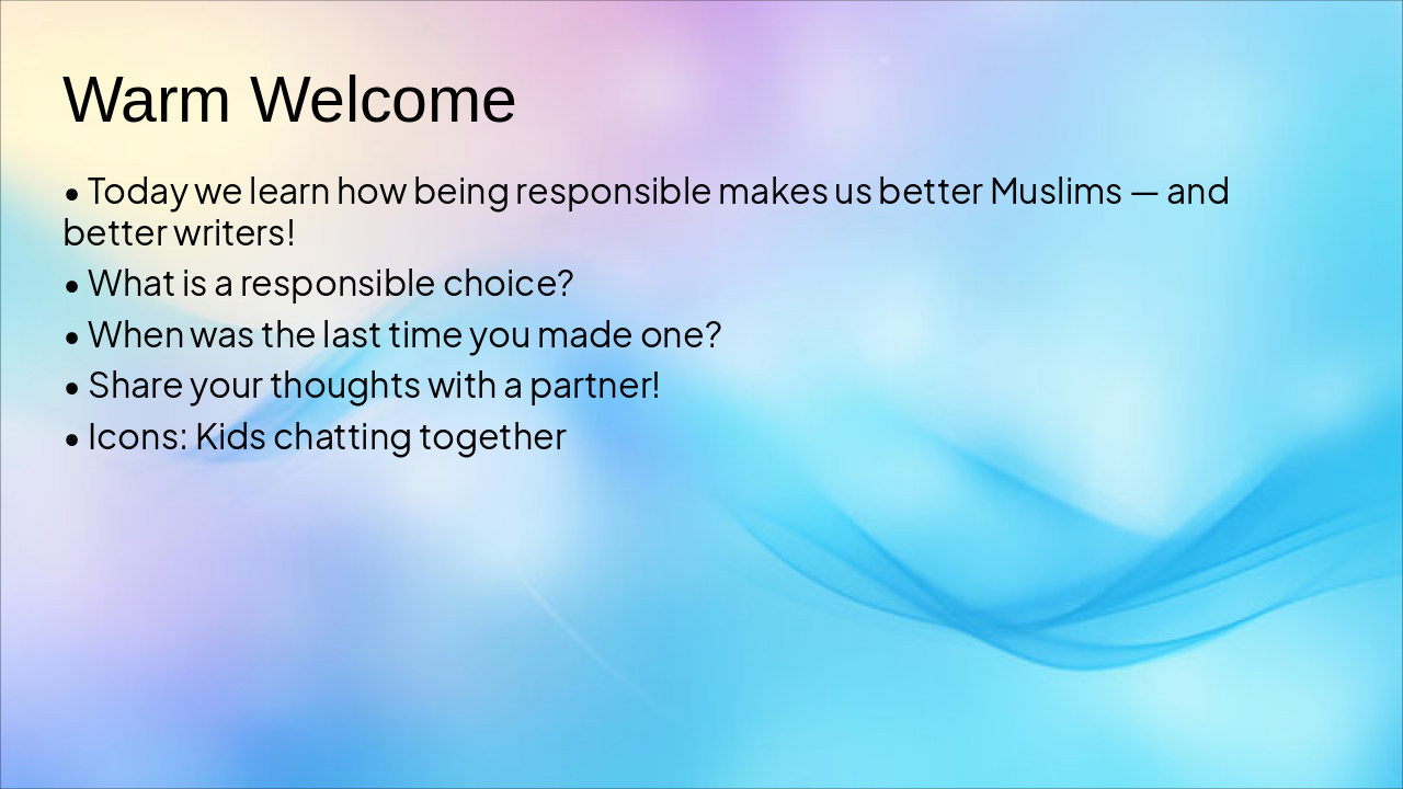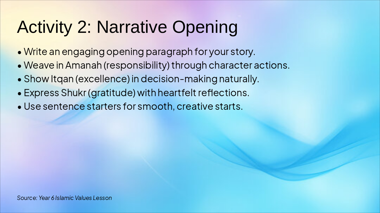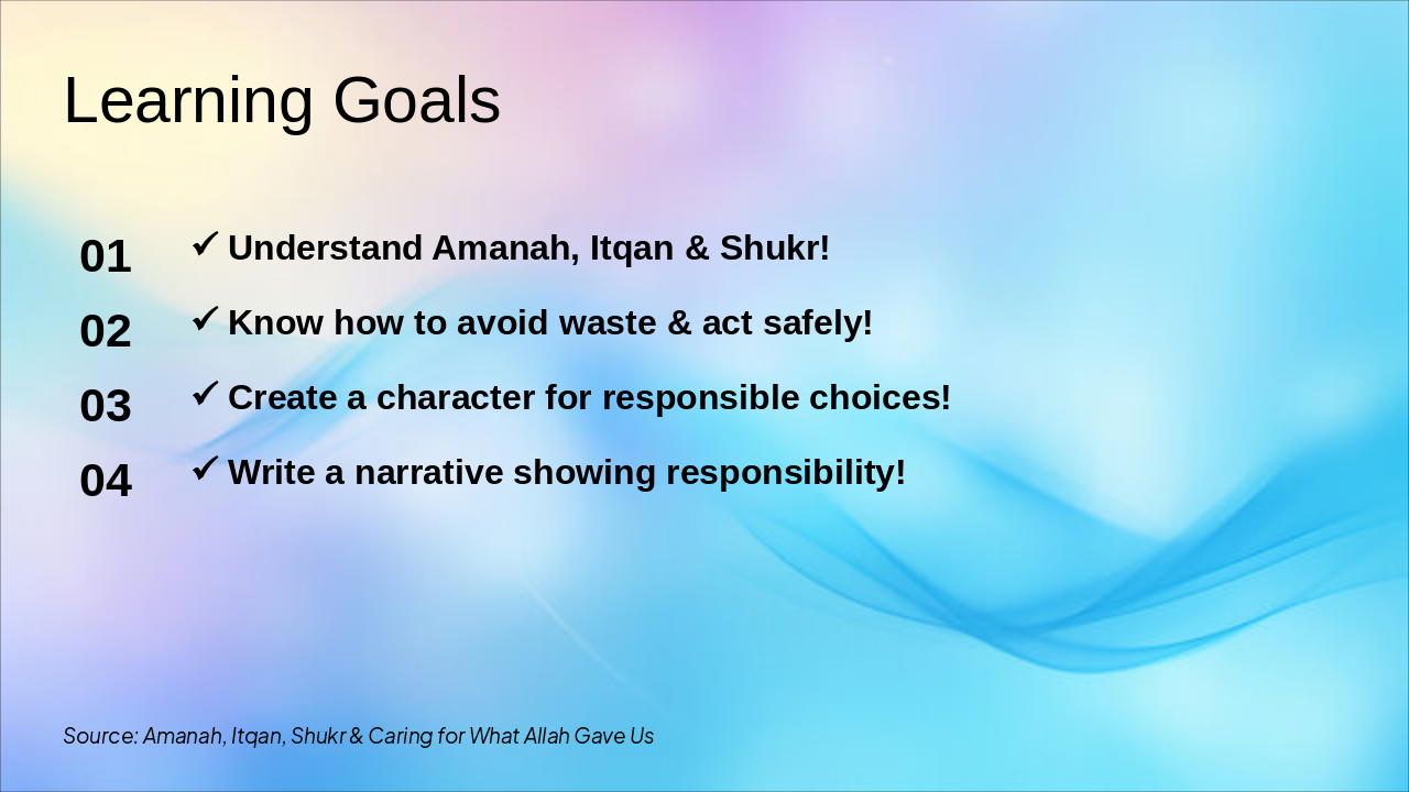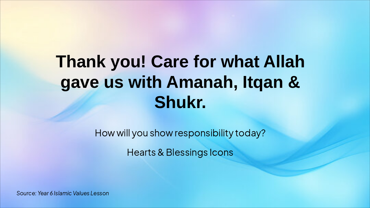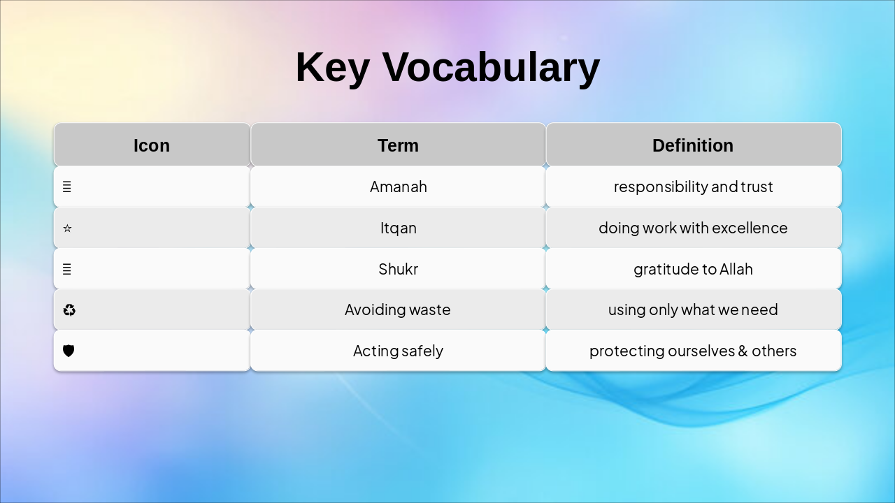 { "headers": [ "Icon", "Term", "Definition" ], "rows": [ [ "🤲", "Amanah", "responsibility and trust" ], [ "⭐", "Itqan", "doing work with excellence" ], [ "🙏", "Shukr", "gratitude to Allah" ], [ "♻️", "Avoiding waste", "using only what we need" ], [ "🛡️", "Acting safely", "protecting ourselves & others" ] ] }