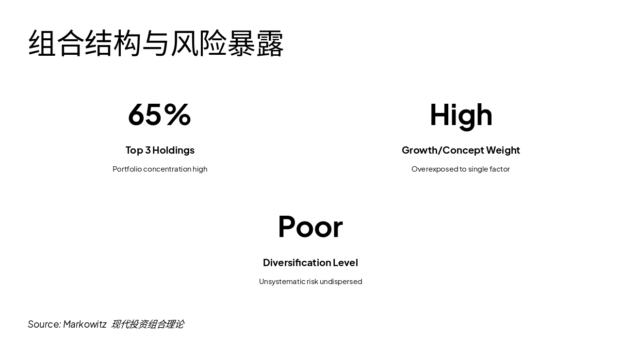 The portfolio exhibits high concentration, with the top 3 holdings comprising 65%. It has high growth/concept weight and poor diversification, leading to overexposure to single factors and undispersed unsystematic risk.