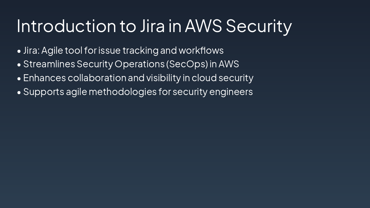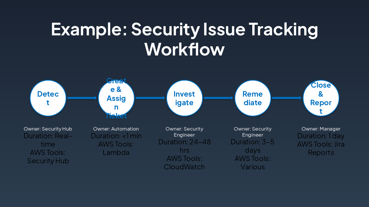 This slide depicts the Security Issue Tracking Workflow, with phases including Detect (Security Hub, real-time), Create & Assign Ticket (Automation/Lambda, <1 min), Investigate (Security Engineer/CloudWatch, 24-48 hrs), Remediate (Security Engineer/Various, 3-5 days), and Close & Report (Manager/Jira Reports, 1 day). It structures the process by phase, owner, duration, and AWS tools for efficient security management.
