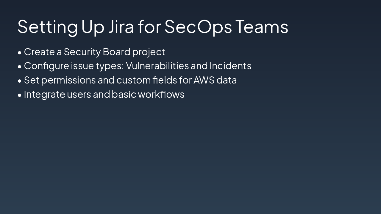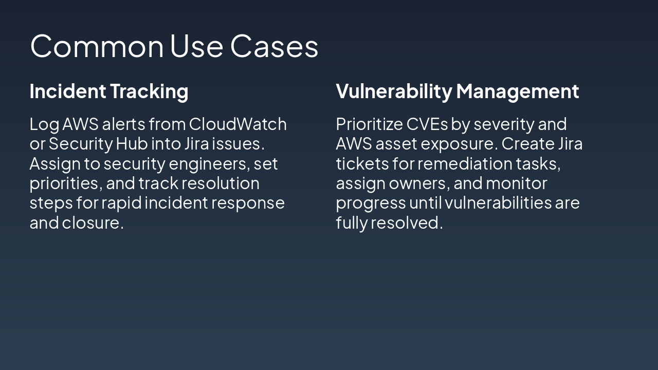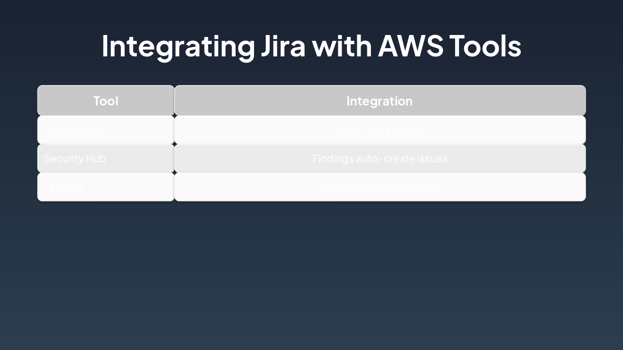 { "headers": [ "Phase", "Owner", "Duration", "AWS Tools" ], "rows": [ [ "Detect", "Security Hub", "Real-time", "Security Hub" ], [ "Create & Assign Ticket", "Automation", "<1 min", "Lambda" ], [ "Investigate", "Security Engineer", "24-48 hrs", "CloudWatch" ], [ "Remediate", "Security Engineer", "3-5 days", "Various" ], [ "Close & Report", "Manager", "1 day", "Jira Reports" ] ] }
