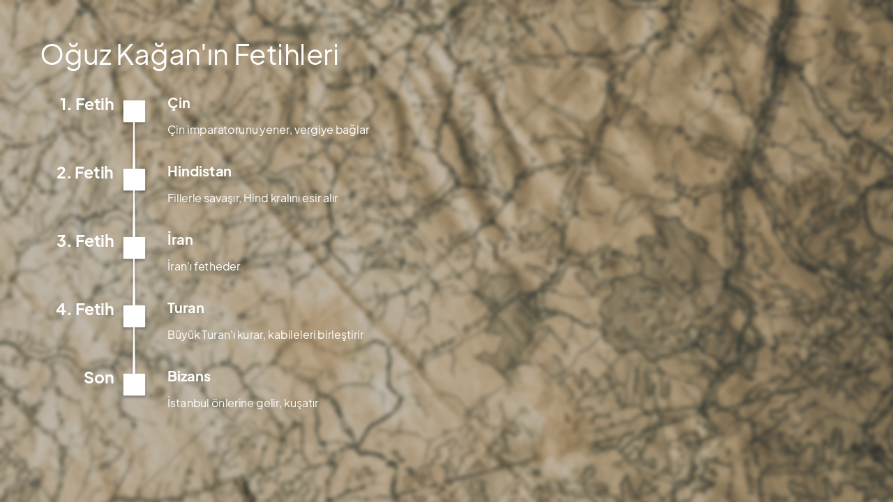 1. Fetih: Çin Çin imparatorunu yener, vergiye bağlar 2. Fetih: Hindistan Fillerle savaşır, Hind kralını esir alır 3. Fetih: İran İran'ı fetheder 4. Fetih: Turan Büyük Turan'ı kurar, kabileleri birleştirir Son: Bizans İstanbul önlerine gelir, kuşatır