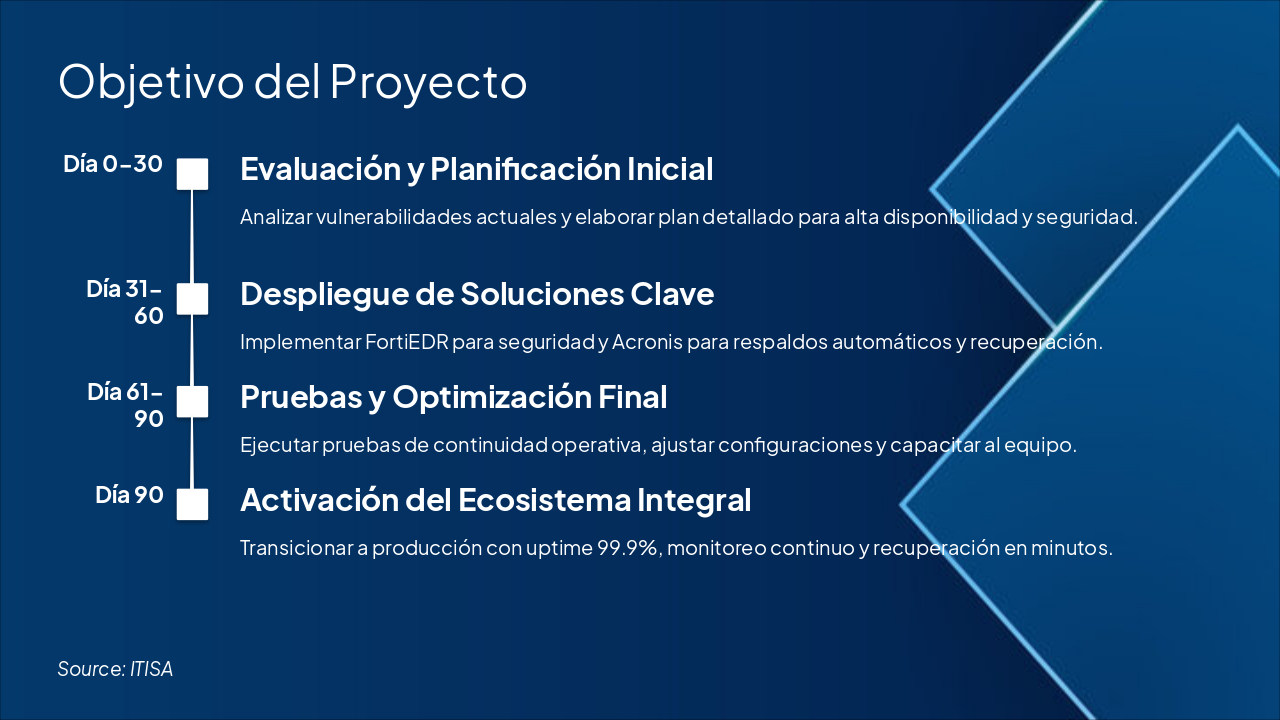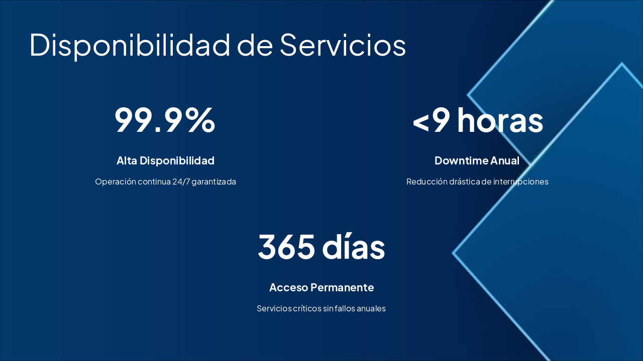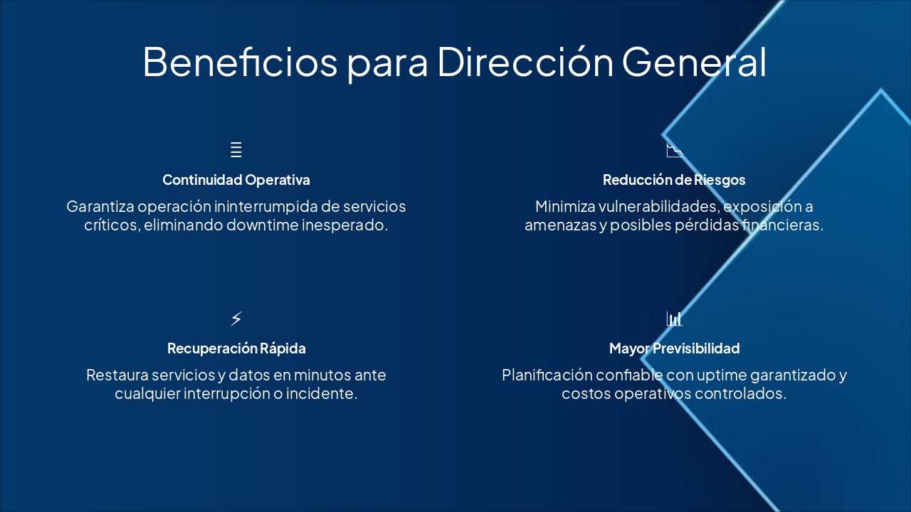 { "features": [ { "icon": "🖥️", "heading": "Alta Disponibilidad VPS", "description": "Infraestructura virtual escalable asegura 99.9% uptime para servicios críticos." }, { "icon": "🛡️", "heading": "Seguridad FortiEDR", "description": "Prevención de amenazas avanzadas con monitoreo continuo en endpoints." }, { "icon": "💾", "heading": "Recuperación Acronis", "description": "Respaldos automáticos y restauración en minutos minimizando downtime." }, { "icon": "🔗", "heading": "Ecosistema Integrado", "description": "Modelo unificado combina continuidad operativa y seguridad homogénea." }, { "icon": "📊", "heading": "Monitoreo Continuo", "description": "Visibilidad total y respuesta inmediata a cualquier incidente potencial." }, { "icon": "🎯", "heading": "Continuidad Garantizada", "description": "Protección integral transforma riesgos en estabilidad operativa resiliente." } ] }
