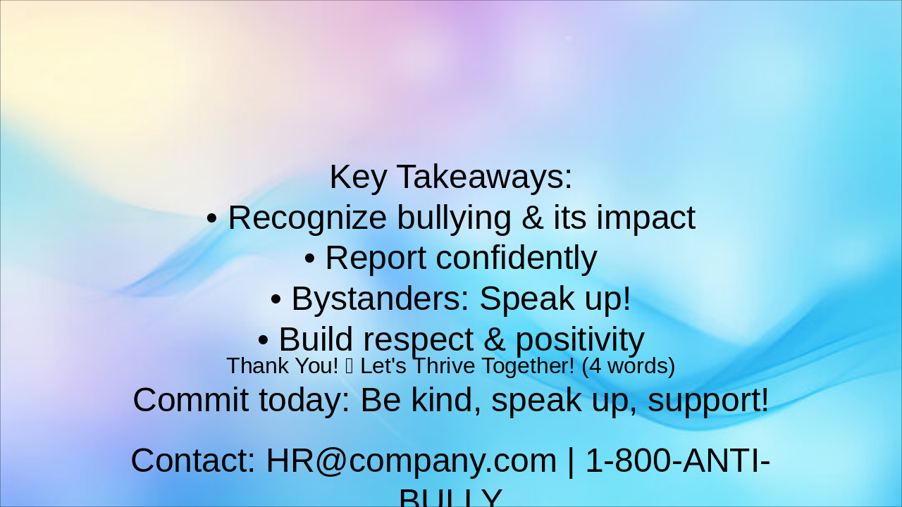 > 'Bystanders, your courage changes everything! If you see bullying, say something—intervene safely, support the victim, and unite for a respectful workplace.'