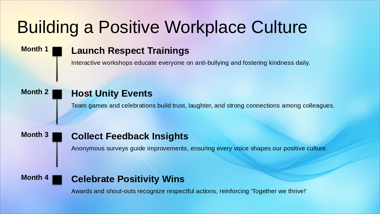 Feature an uplifting image of a diverse team high-fiving. Include bullet points: Intervene safely, support the victim, speak up! Use vibrant colors to empower and motivate.
