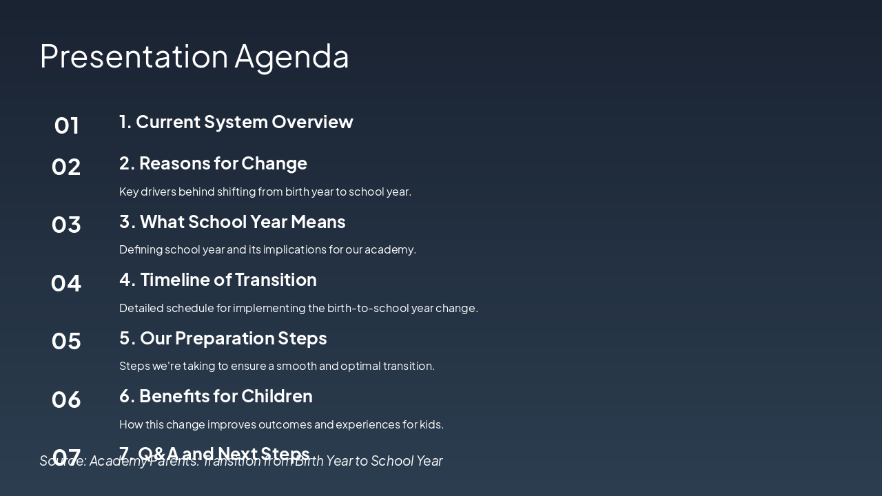 This agenda outlines a presentation on transitioning from birth year to school year alignment in the academy, covering the current system overview, reasons for change, and definitions. It further details the transition timeline, preparation steps, benefits for children, and concludes with Q&A and next steps.