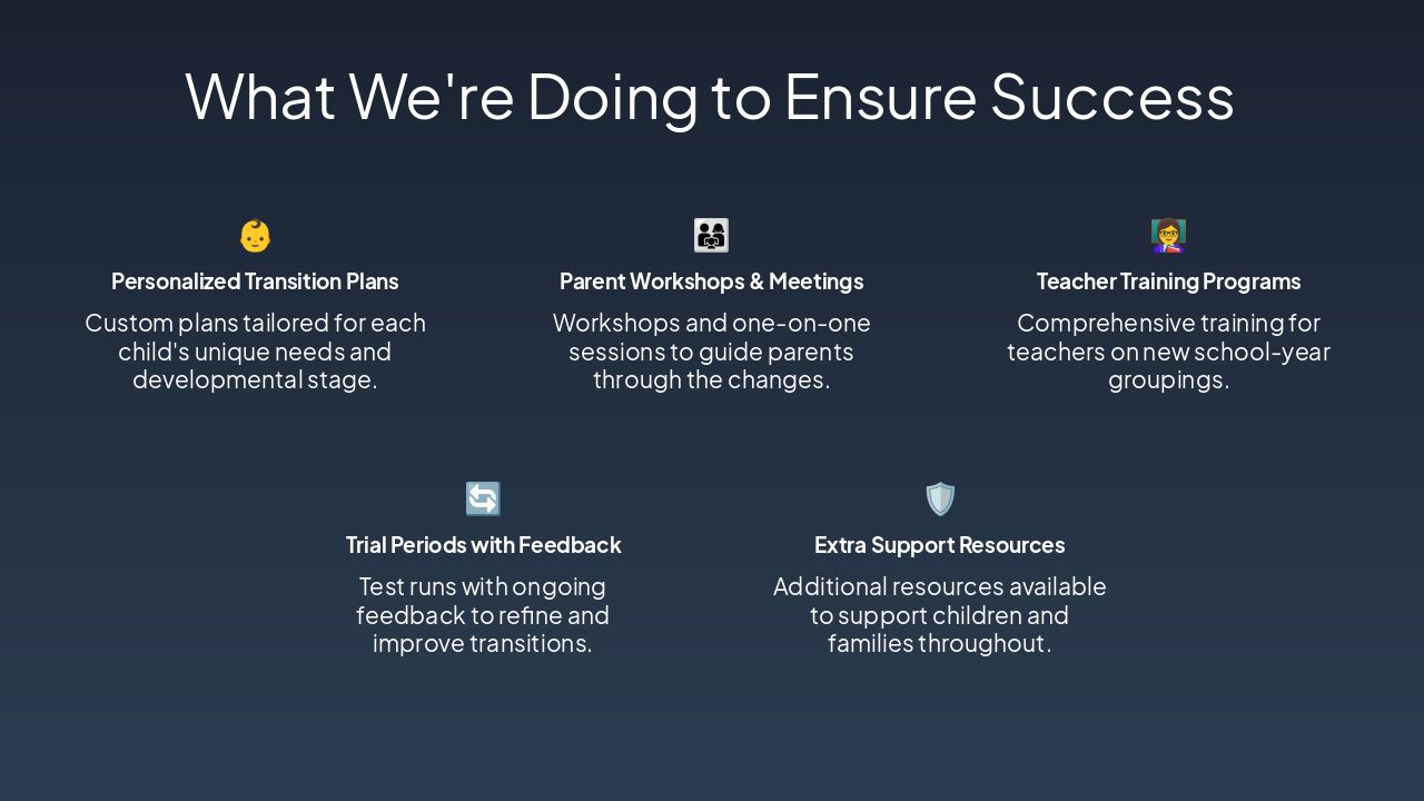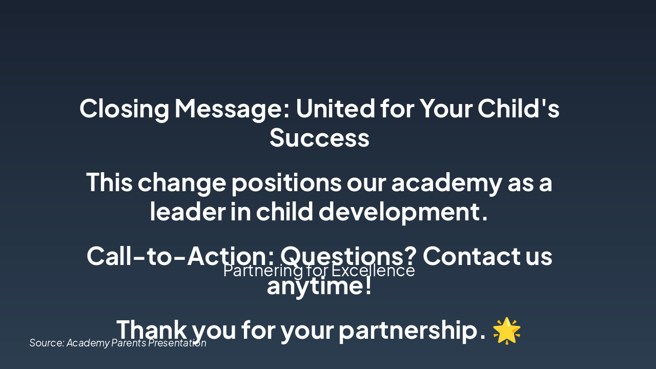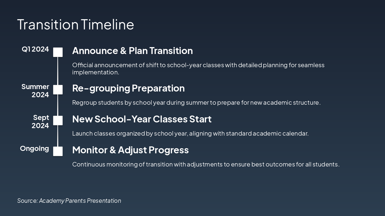 Outline the key sections of the presentation to set expectations for parents on the upcoming changes and our preparations.
