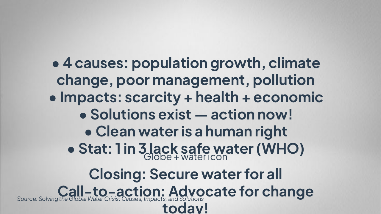 This title slide introduces "Solving the Global Water Crisis" by posing the question "What is the water crisis?" and explaining why it matters for health, food, and the economy. It outlines the presentation structure: today's 4 causes leading to 4 problems, followed by solutions.