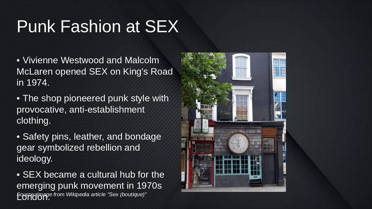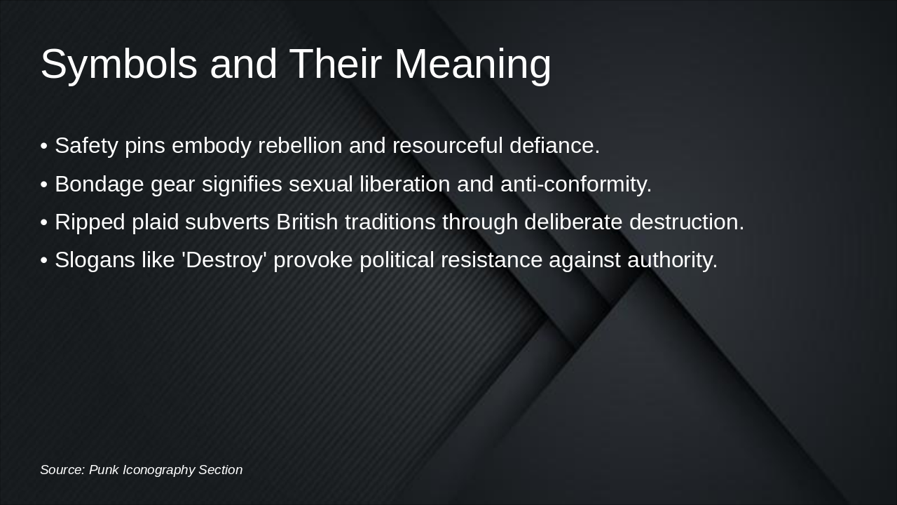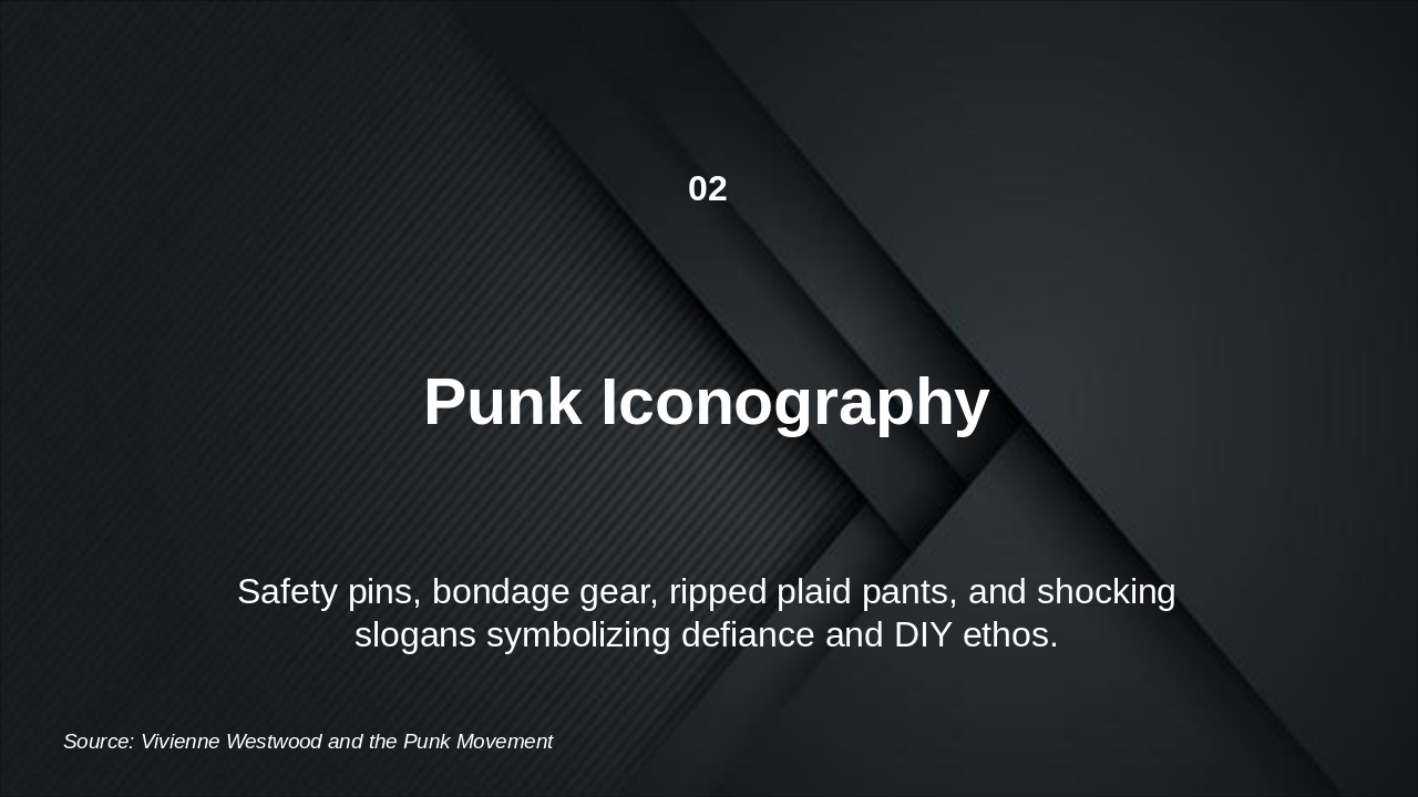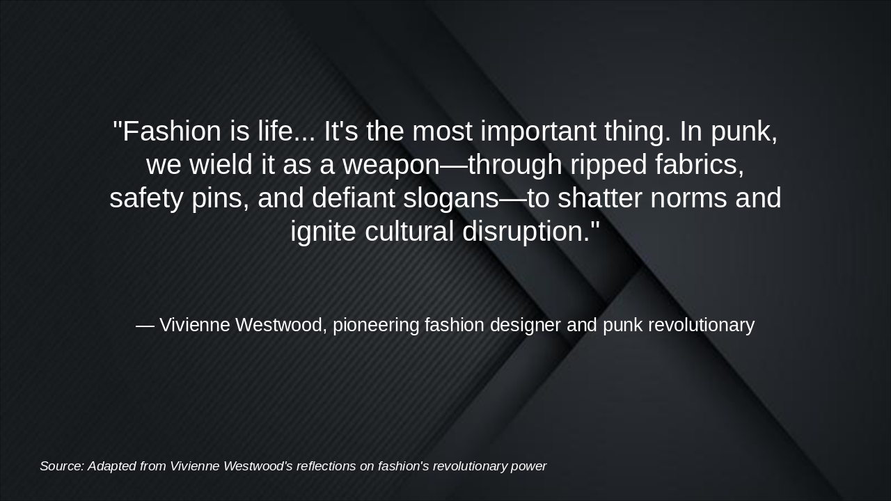 The slide, titled "Punk's Defiant Voice," features a quote from Vivienne Westwood, a pioneering fashion designer and punk revolutionary. In it, she declares fashion as life's most vital element, used in punk as a weapon via ripped fabrics, safety pins, and bold slogans to challenge norms and spark cultural upheaval.