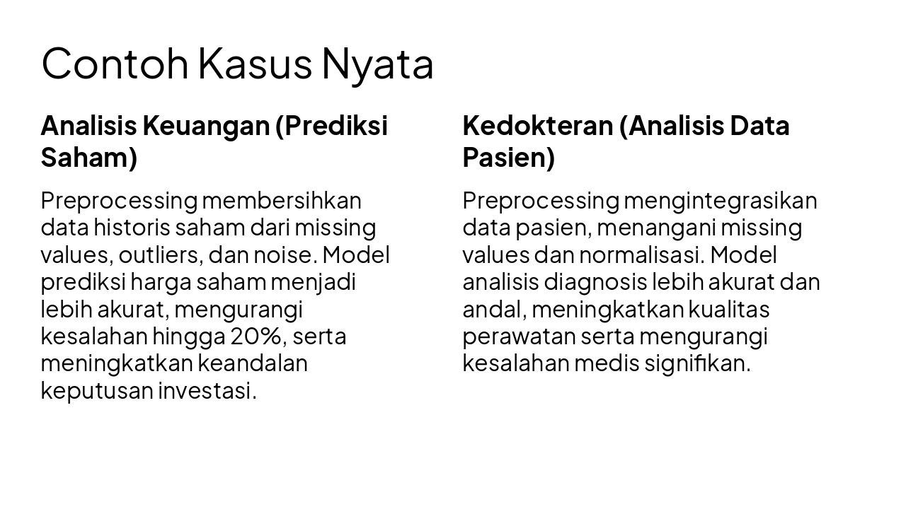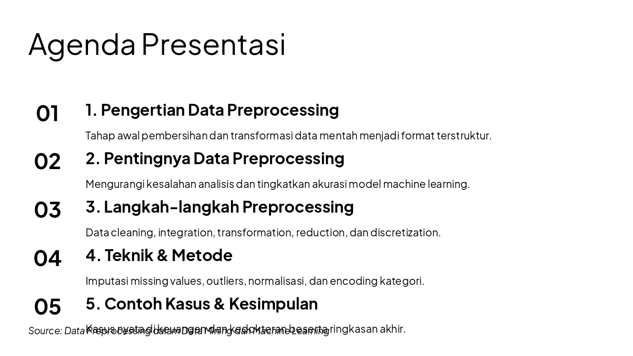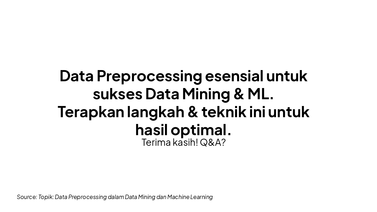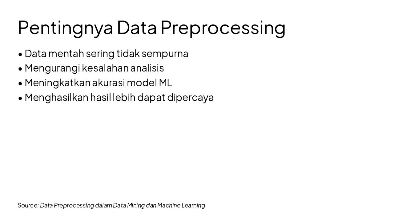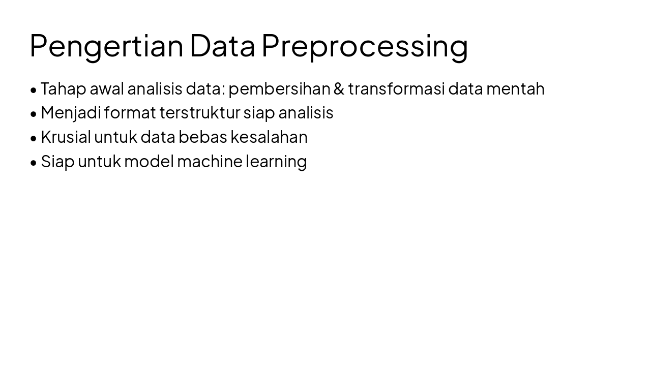 Langkah-langkah Data Preprocessing: 1. Data Cleaning (missing values, outliers). 2. Data Integration (gabung sumber). 3. Data Transformation (normalisasi, encoding). 4. Data Reduction (PCA). 5. Data Discretization (kontinu ke diskrit). Pengertian: Tahap awal pembersihan dan transformasi data mentah menjadi format terstruktur untuk analisis. Pentingnya: Mengurangi kesalahan, tingkatkan akurasi model ML.