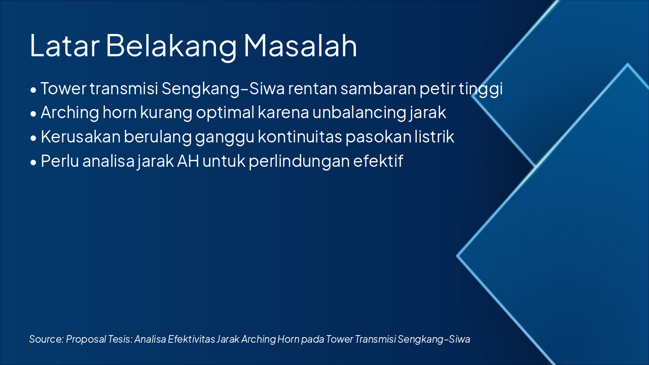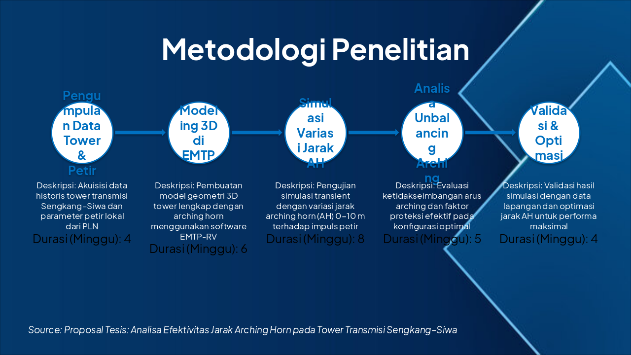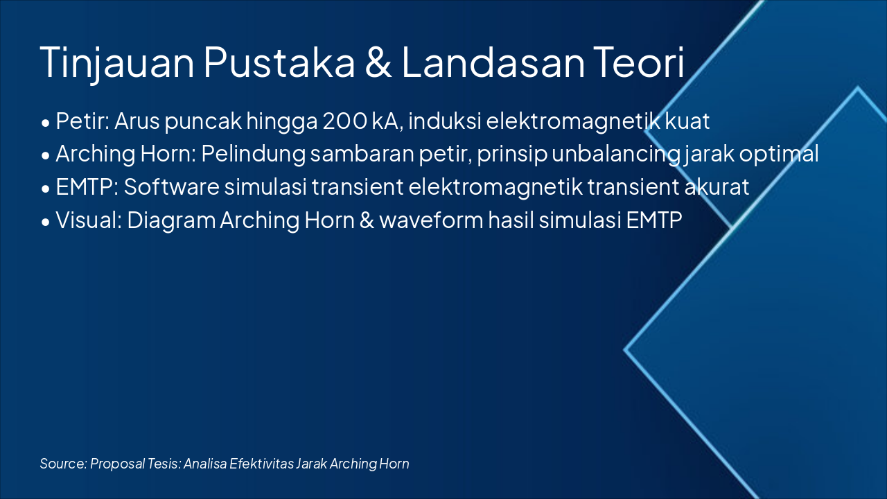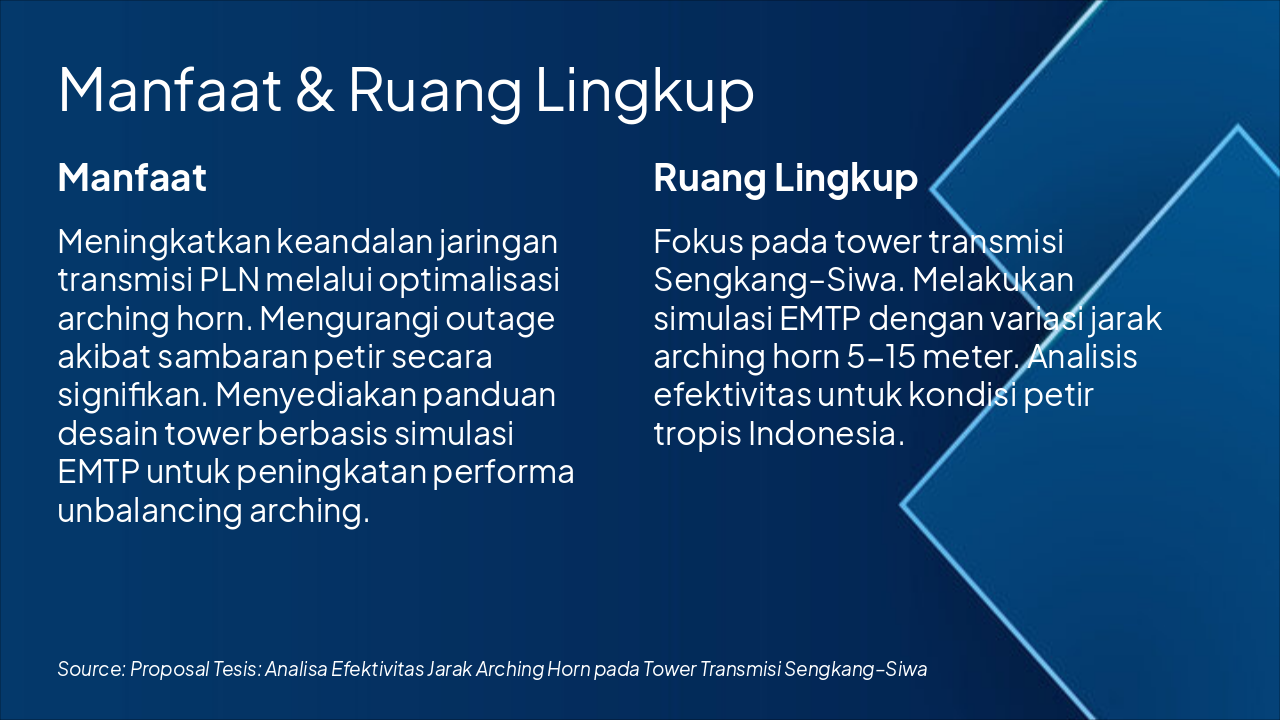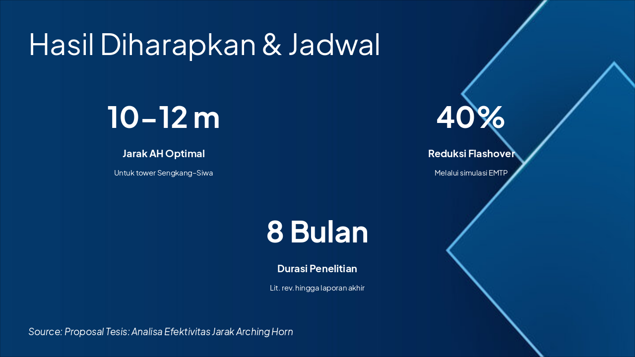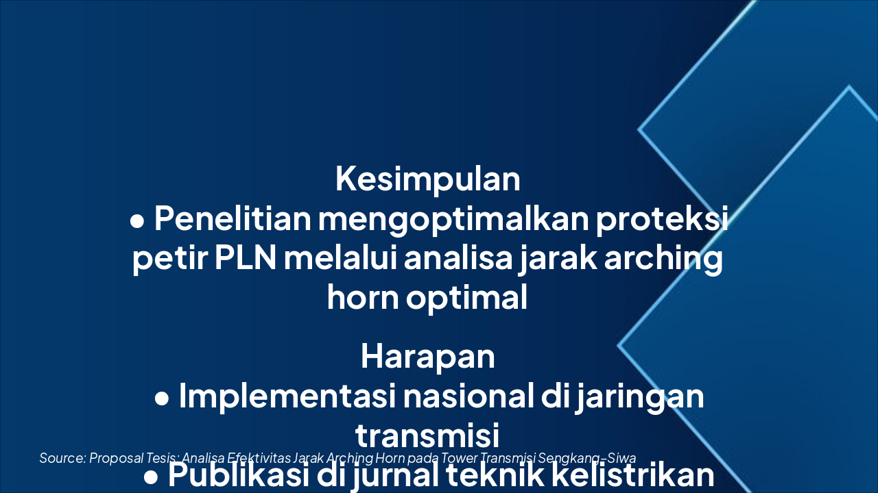 Penelitian mengoptimalkan proteksi petir PLN melalui analisis jarak arching horn optimal. Harapan mencakup implementasi nasional di jaringan transmisi, publikasi jurnal, serta daftar pustaka utama seperti IEEE Std. 1243-2010, Dokumen Teknis PLN, dan EMTP User Manual, diakhiri dengan ucapan terima kasih serta ajakan masukan untuk tesis.